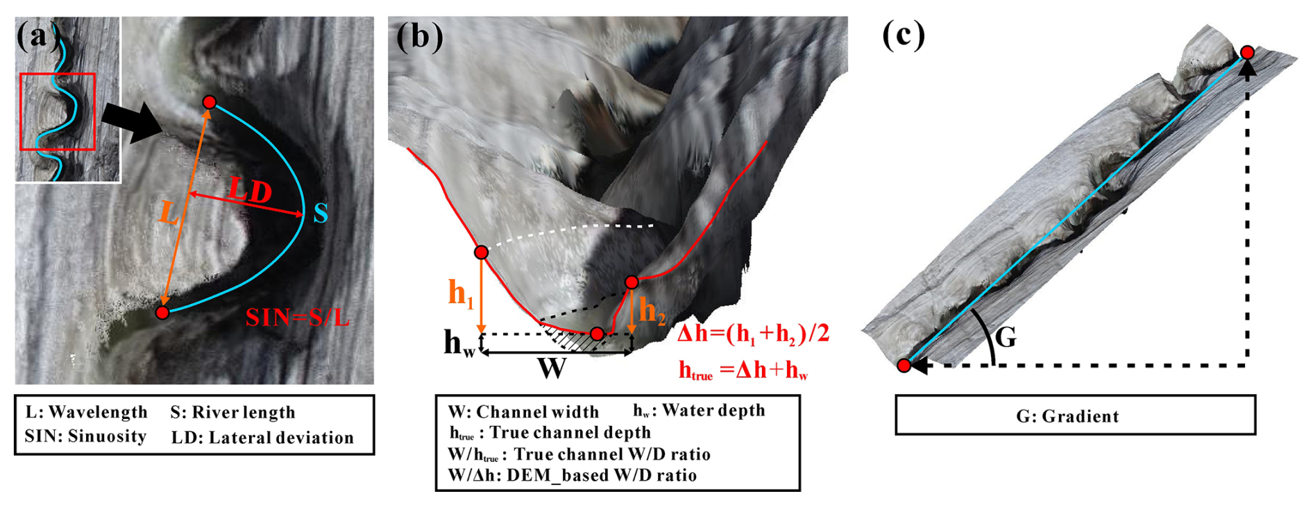 Figure 2Diagrams showing the process of obtaining the channel geometric parameters: (a) sinuosity and lateral deviation of an individual meander; (b) geometry of the channel profile (width, depth, and width/depth ratio); the white dashed line indicates the maximum slope, and the black dashed line and shaded area indicate the water surface and underwater channel profile, respectively; (c) the channel gradient.