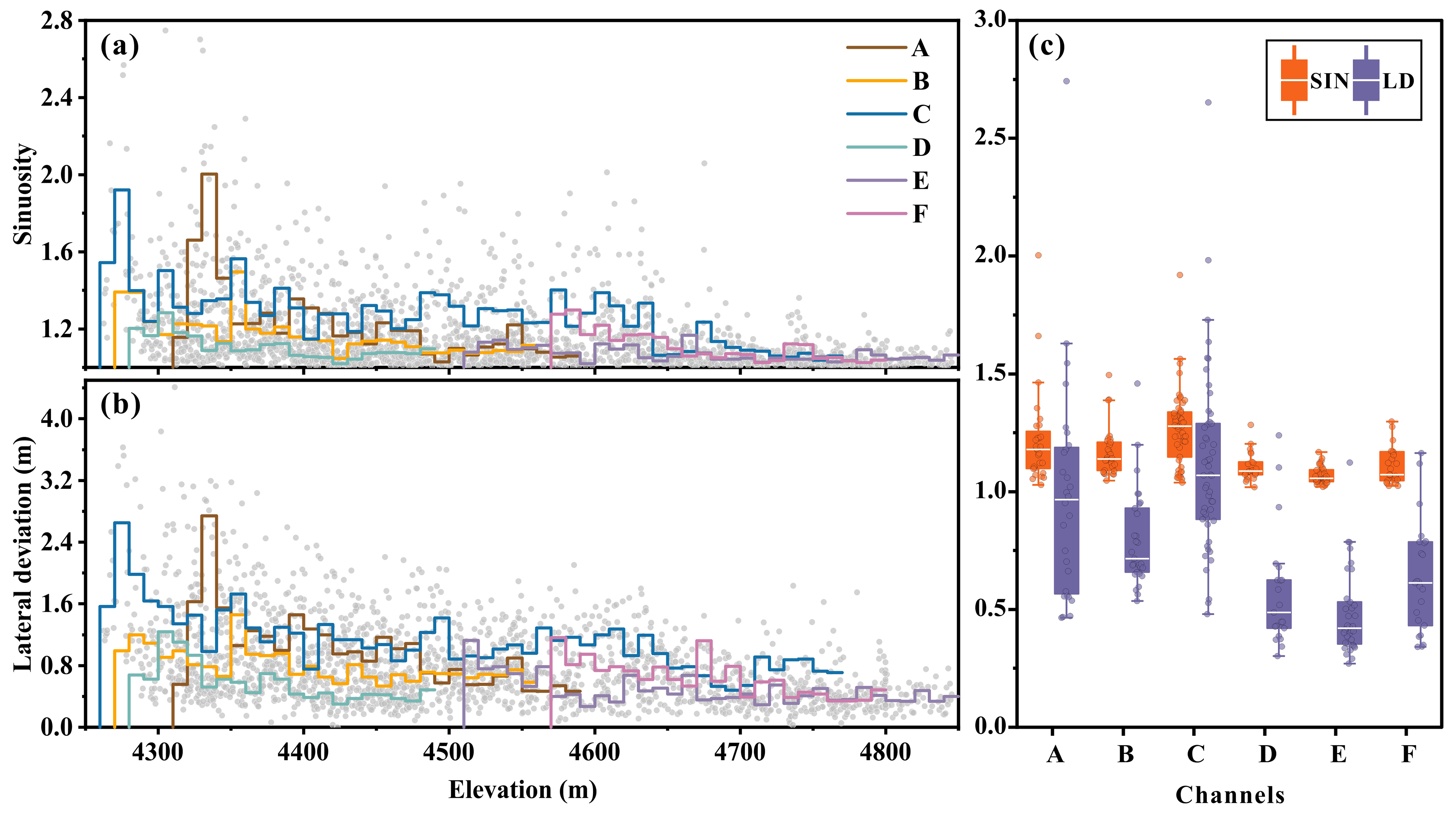 Figure 5Variations in the (a) sinuosity and (b) lateral deviation of six supraglacial channels (gray dots indicate values at each meandering) and their mean at a 10 m elevation interval (colored stairs); (c) box plot of 10 m average sinuosity and lateral deviation for six supraglacial channels, where the box represents the interquartile range (IQR), the whiskers denote 1.5 times the IQR from both ends of the box, and the white horizontal line shows the median; the labeling A to F corresponds to channels A to F as shown in Fig. 4a.