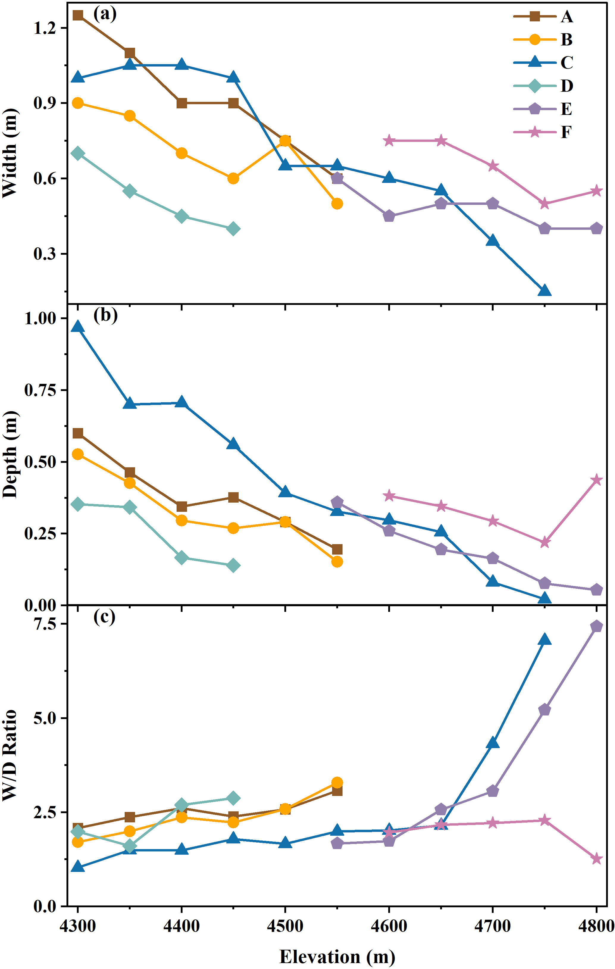 Both channel width and depth of all six supraglacial channels generally show decreasing trends with increasing elevation (Fig. 7a and b), with the maximum channel width and depth (1.25 and 1.00 m, respectively) observed near the channel outfall at the glacier terminus. In general, for a given channel, its width increases with depth and vice versa; however, exceptions are found for the lower reaches of channel C, which does not have the widest channel near the outlet with the deepest channel. Another noteworthy point is that, instead of the outlet, channel F has the deepest and relatively wider channel at its headwater at 4800 m a.s.l., possibly because its headwater is a shallow supraglacial lake over a relatively flat mountain pass that provides warmer meltwater to the channel.