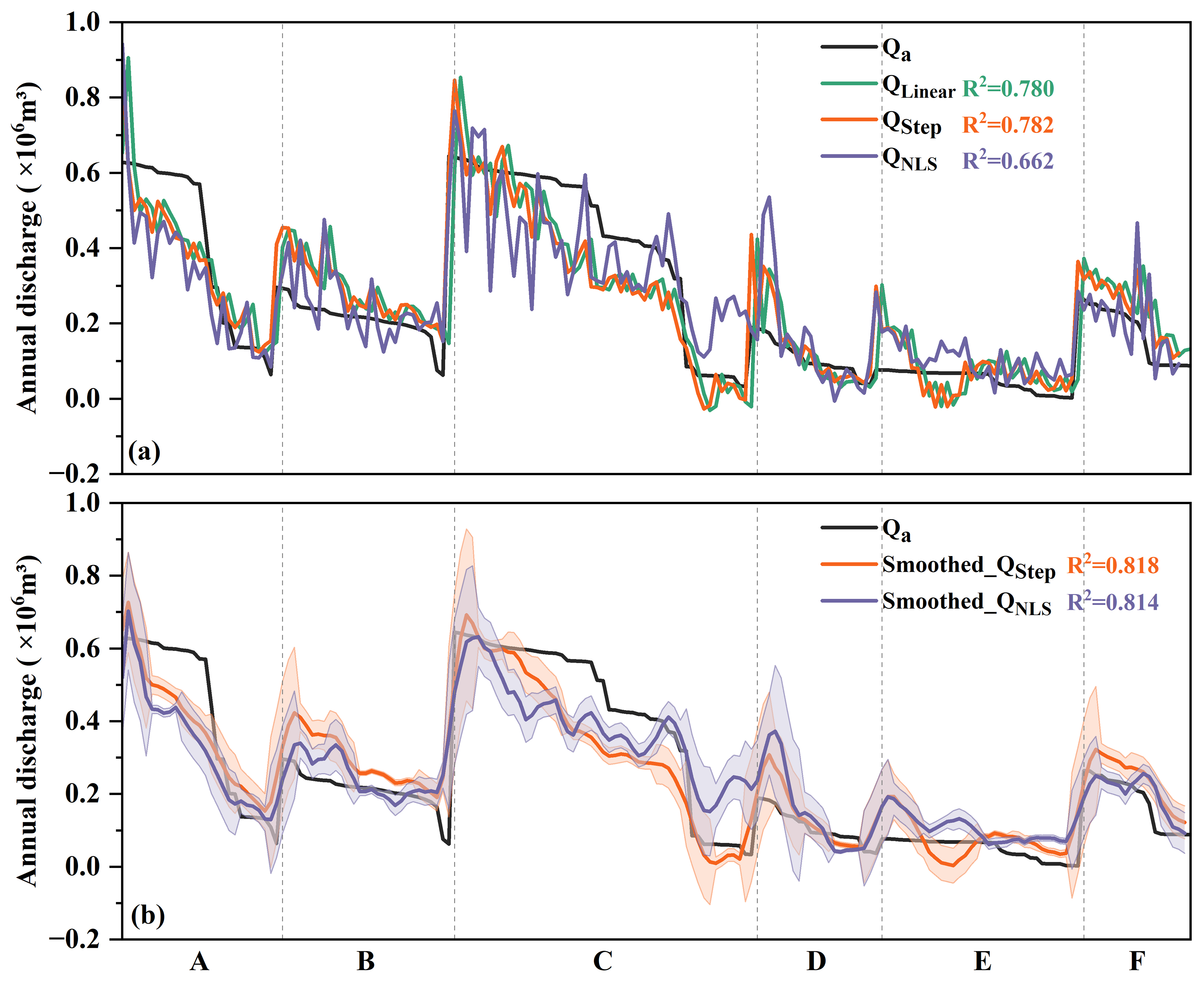Figure 8Comparison between observed annual discharge (Qa) and (a) original results and (b) five-point moving average fitted results using linear, stepwise, and NLS regression models. The shaded error bands indicate twice the standard deviation range. The x axis is arranged at an order of increasing elevation for each channel meander, and each channel is divided by vertical gray dashed lines.