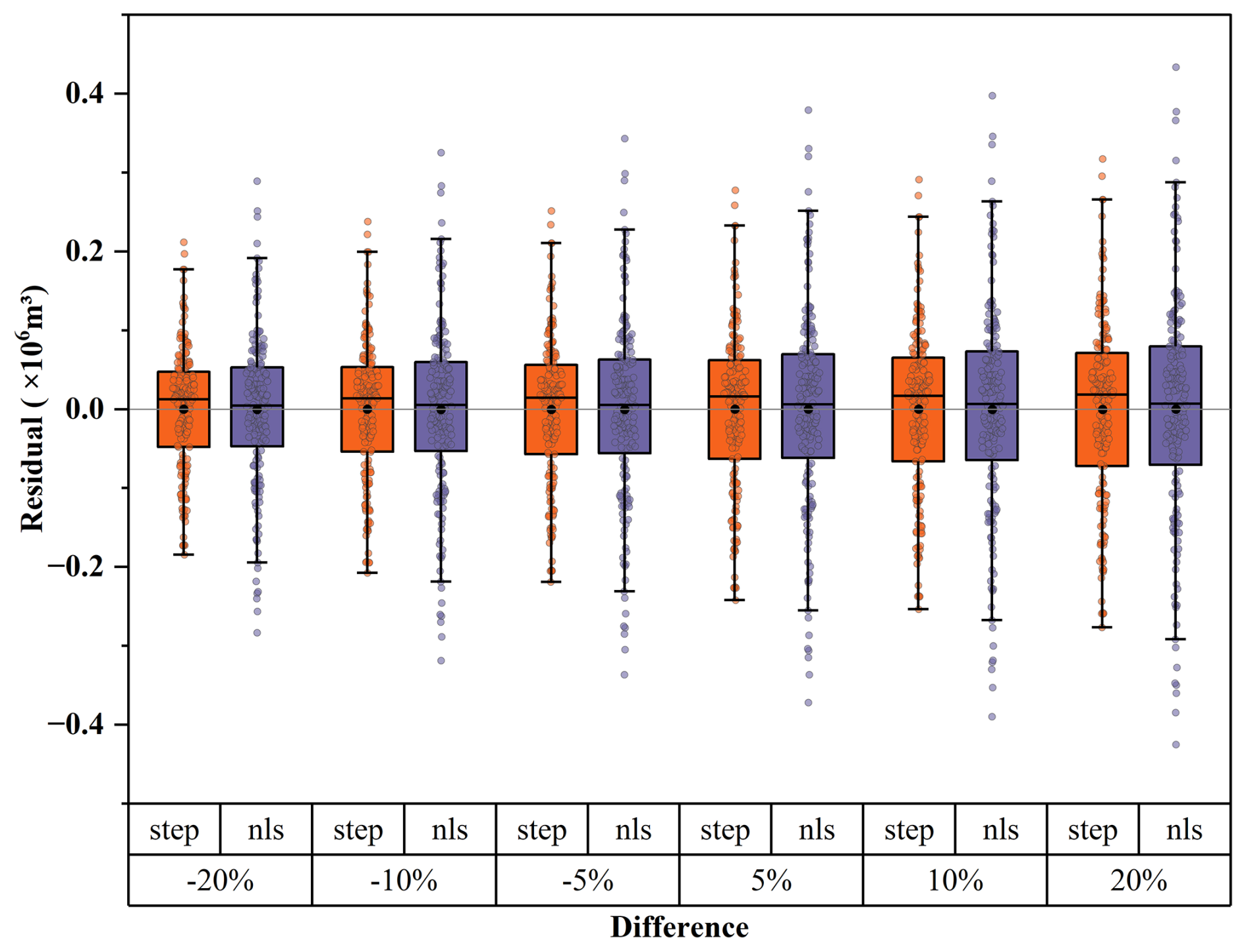 Regarding the error in the precipitation pattern over mountain glaciers, although the elevation effect of precipitation is obtained from in situ precipitation observations, the influence of wind and local topography also introduces some uncertainty in the precipitation distribution. To evaluate the combined effect of uncertainties in mass balance and precipitation on glacier discharge calculations, the meltwater volume of each pixel of the Qiyi Glacier was manually changed by a range of ±5 %, ±10 %, and ±20 % for both stepwise regression and NLS model results. Based on the reference from Xu et al. (2019), we set the maximum uncertainty range of our stake-based mass balance estimates at ±20 %. Under the maximum uncertainty scenario (20 %), when compared with the original models without additional errors, the mean absolute error (MAE) for both stepwise and NLS methods remained very small (0.092 and 0.109×106 m3). The RMSE increased slightly from 0.097 and 0.122×106 m3 to 0.117 and 0.146×106 m3, while the nRMSE rose from 10.60 % and 12.87 % to 19.68 % and 17.06 % (Fig. 9), showing reasonable robustness of the two current regression methods. These results indicate that although spatial extrapolation uncertainty is the dominant error source, it does not affect our finding that channel geometry can be used to estimate glacier runoff.