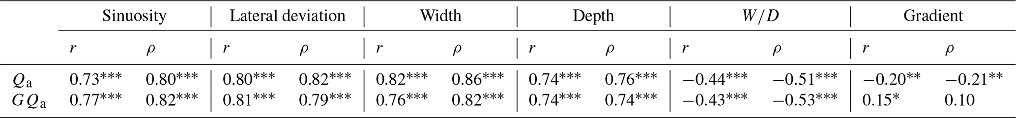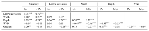 Table 2The partial correlation coefficient between each two geometric parameters, with discharge Qa and water potential energy GQa as control variables. Significance levels of 0.05, 0.01, and 0.001 are denoted by *, **, and ***, respectively.