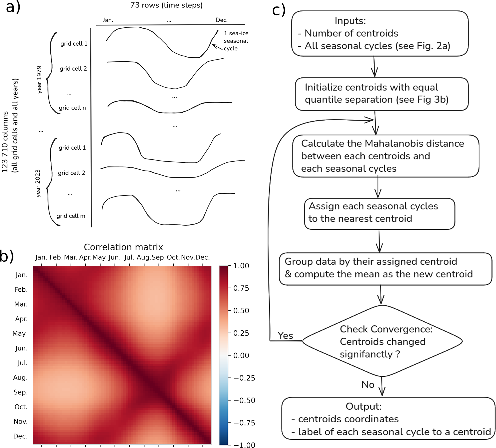 We implement a k-means clustering algorithm, which is an unsupervised machine learning method that groups data into subsamples sharing common features (Jain, 2010). It has the advantage of being non-parametric as our data distribution is strongly non-Gaussian. Indeed, SIC is bounded between 0 and 1 with high occurrences of values close to 0 and 1. It is an iterative method that minimizes a cost function being the sum of the squared distance (distance in a sense that would be defined later) between each seasonal cycle and its nearest cluster center (also called centroid). At each iteration, the coordinates of the centroids are updated. The initialization of centroids coordinates using k-means++ concept (the first centroid is chosen randomly, the second is the farthest-away, the third the farthest-away of the first and second, and so on) has been tested and is partly impacting our results. Therefore, we choose a different initialization strategy. We initialize the centroids coordinates based on seasonal cycles that separate the data into equal quantiles. For a clustering involving two clusters, the initializations are the two seasonal cycles of 0.33 and 0.66 quantiles of all seasonal cycles; for a clustering involving three clusters, the initializations are the three seasonal cycles of 0.25, 0.5, and 0.75 quantiles, and so on (Fig. 3b). The quantiles are calculated over all the seasonal cycles considered in this study. This favours initial centroids far from each other to avoid iterating over a local minimum and the clustering is thus deterministic (i.e., it does not present any random aspect). The strategy of initialization based on quantiles has been investigated for synthetic and real dataset and has shown a faster convergence compared to random and K means++ initialization techniques (Jambudi and Gandhi, 2022).