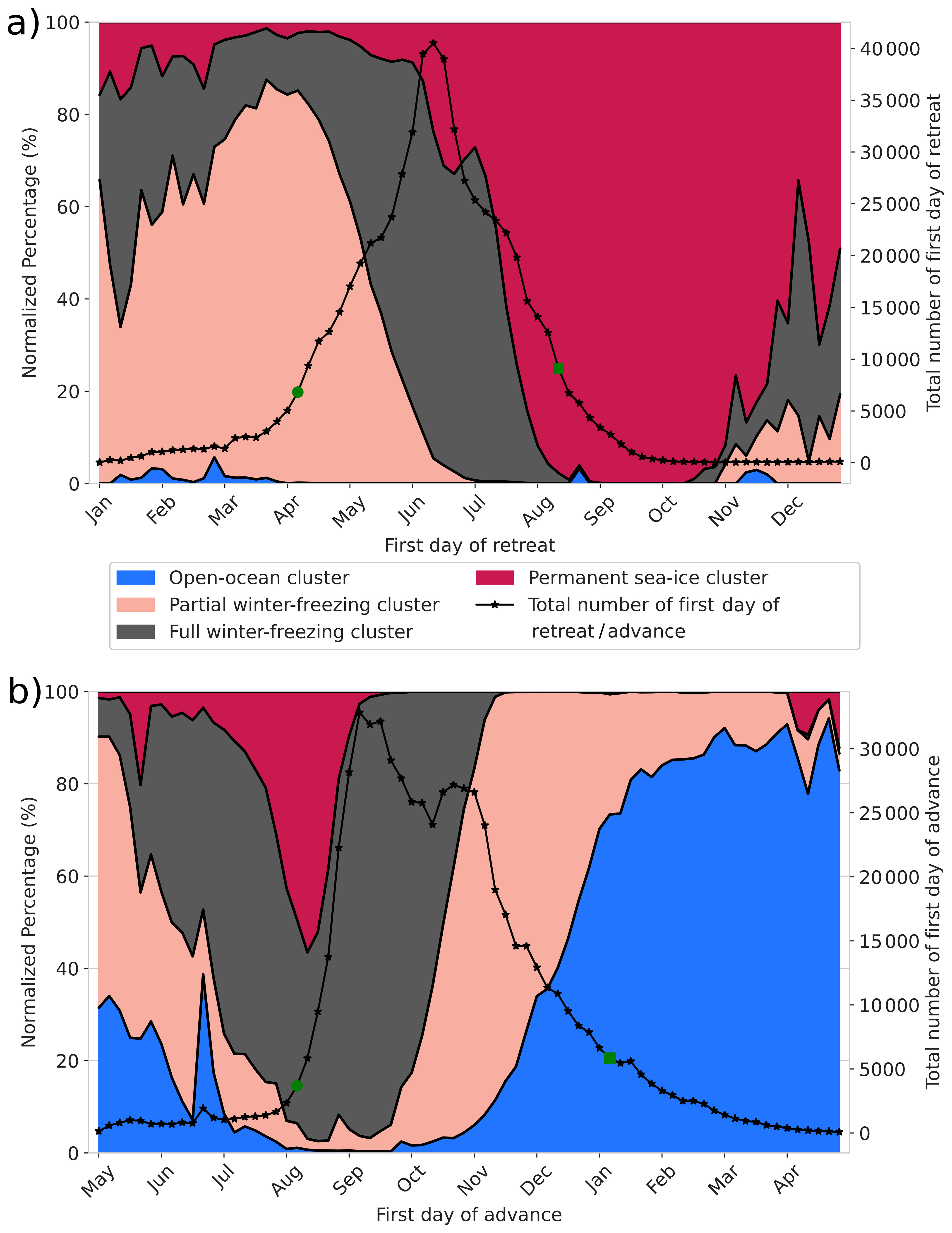 Figure 5Normalized probability of the first date of retreat (a) and first date of advance (b) for each cluster. The solid lines with star markers are the total number of first dates of retreat and first dates of advance for all clusters. The green circle markers (start date) and green square markers (end date) cover the shortest period where around 90 % of the first date of retreat, respectively the first date of advance, for all clusters occurs.