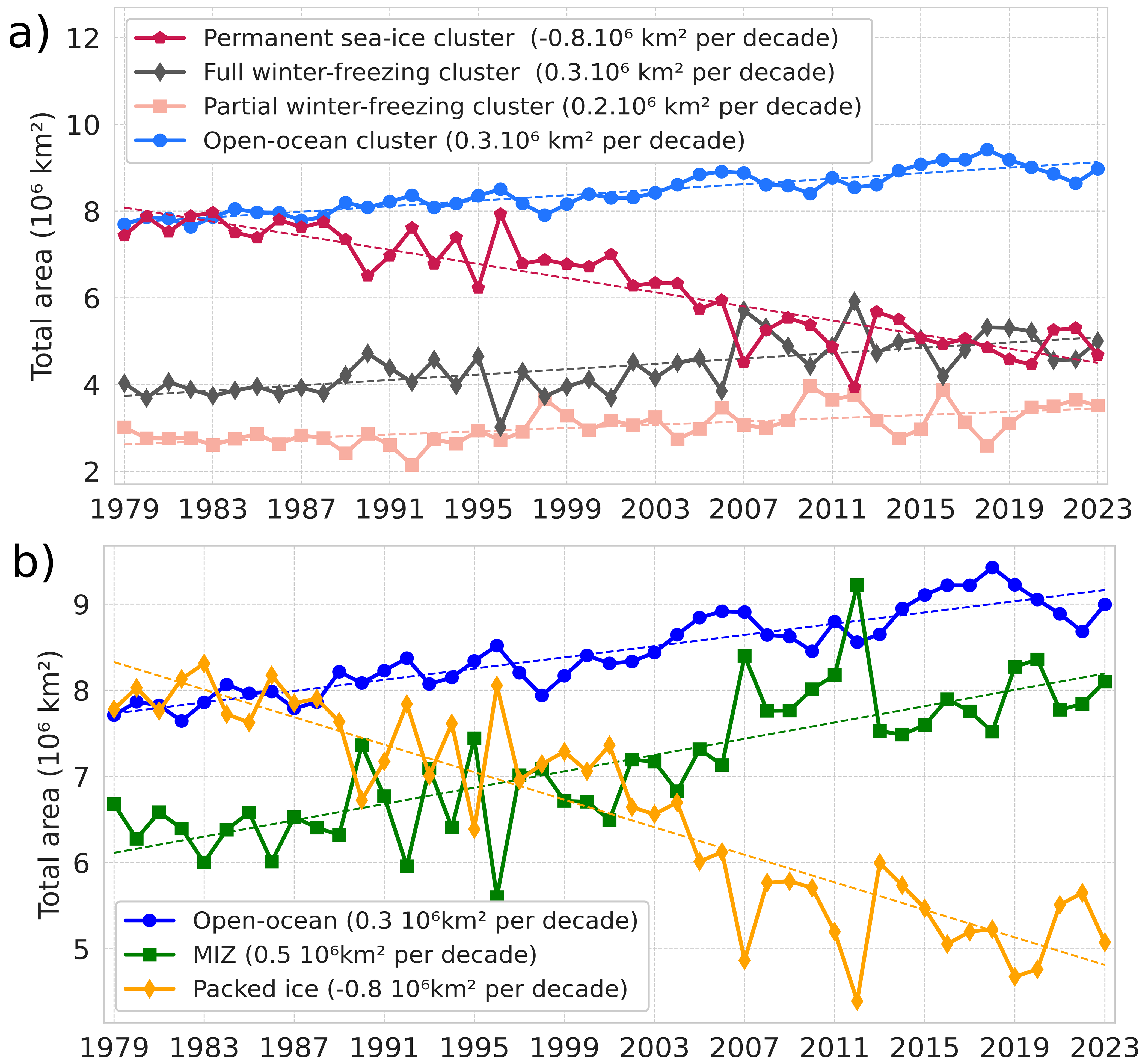 These two methods (Fig. 6a and b) both indicate a shift toward more seasonal and ice-free conditions. Indeed, in the clustering method the permanent sea-ice cluster has notably decreased of the same amount than the packed ice in the classical categorization ( km2 per decade). Also, the open-ocean cluster follows the same trend of the open-ocean category (0.3×106 km2 per decade). The increase in the area of MIZ category is around 0.5×106 km2 per decade and has been demonstrated previously (Cocetta et al., 2024; Song et al., 2025). Therefore, it appears with our clustering that the MIZ is refined into two clusters: the full winter-freezing (0.3×106 km2 per decade) and the partial winter-freezing cluster (0.2×106 km2 per decade). This suggests that the tendency is more likely to shift to a more abrupt melting and growth seasonal cycle (full winter-freezing cluster) compared to a quasi-sinusoidal sea-ice seasonal cycle (partial winter-freezing cluster) or, in other words, that the tendency is more likely to a total ice cover in winter with a short ice-free season (2 months, full winter-freezing cluster) than a partial ice cover in winter with a long ice-free season (4 months, partial winter freezing cluster).
