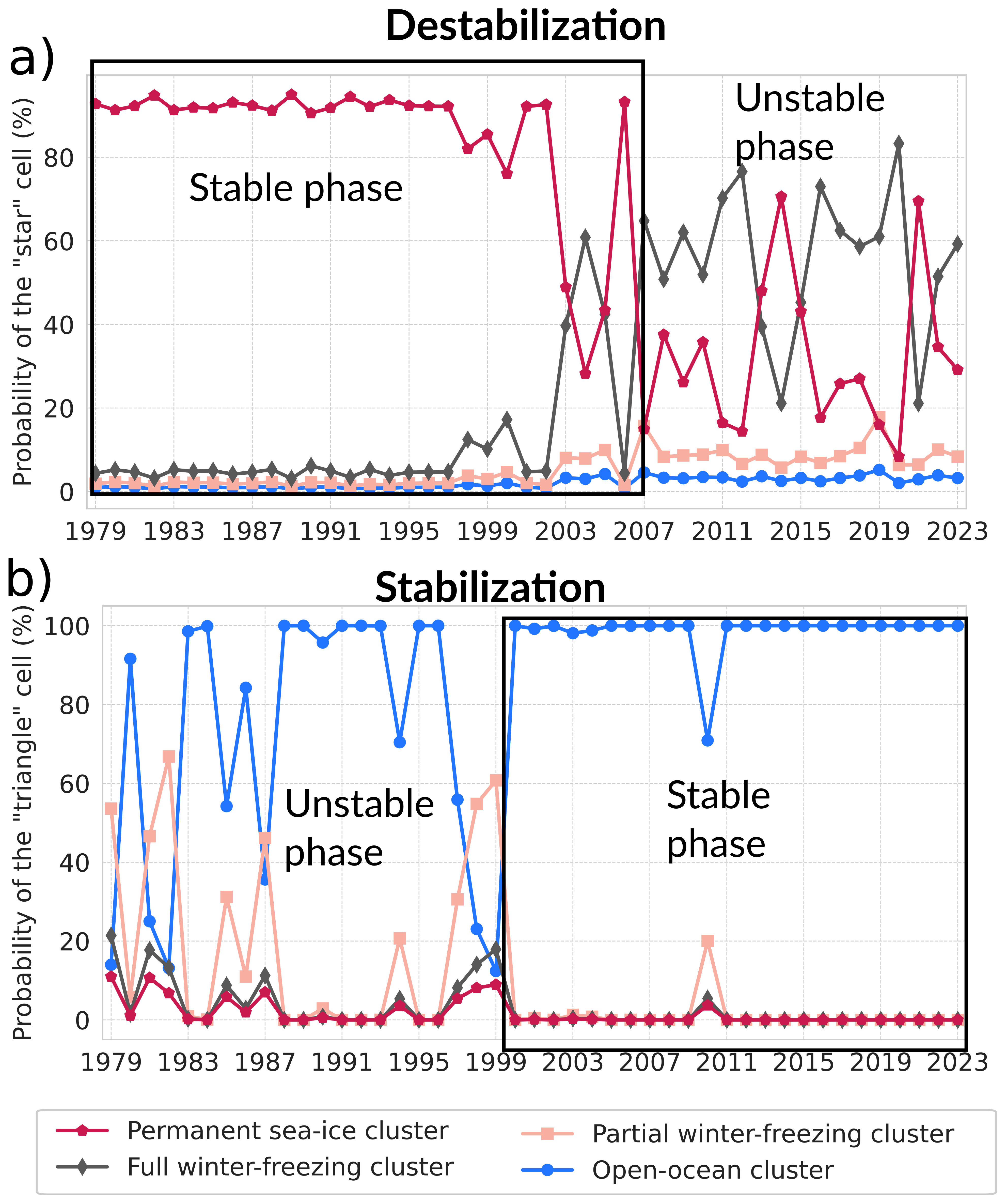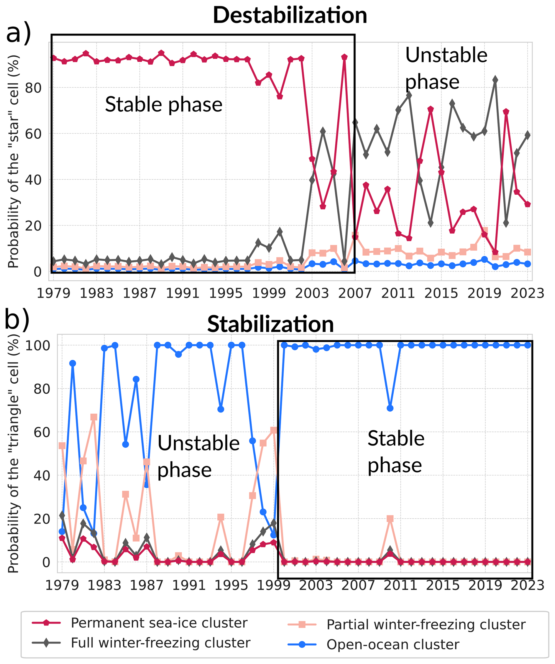 In order to describe the grid-cell evolution of the Arctic sea ice over the period 1979–2023, we further classify each grid cell into four regimes: stable, unstable, destabilization, and stabilization. First, we define a stable phase as a sequence when the cluster having the maximum probability stays the same for at least 10 years in a row, allowing for a tolerance of 1 year to belong to a different cluster within that period. Sensitivity tests have been performed on this definition (Fig. S4), and the results do not change when we apply small definition changes (i.e., 9 to 11 years minimum length of the same cluster with zero to 2 years of tolerance). Second, we label each grid cell as follows: