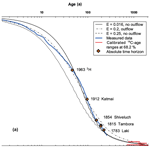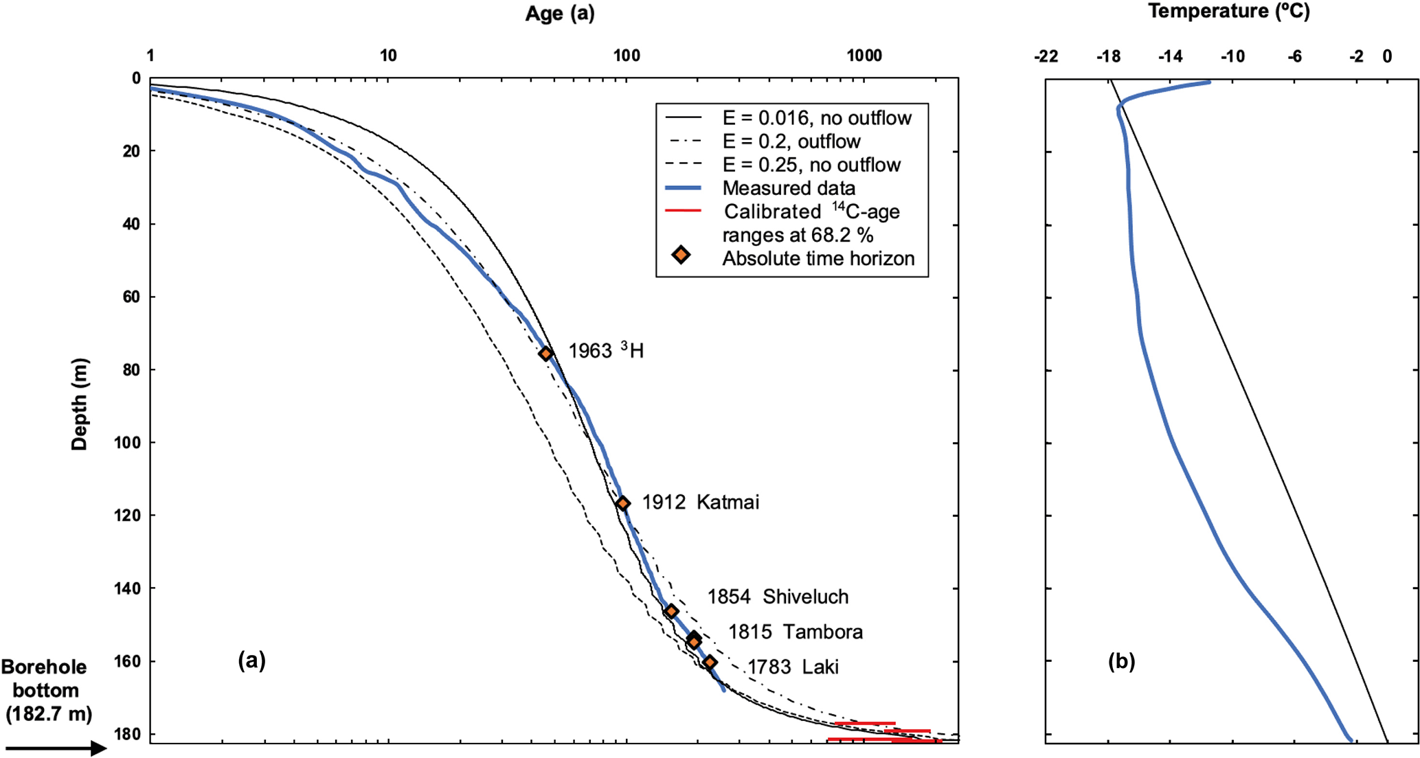 Figure 5 presents vertical profiles of modeled age and temperature of the ice/firn at a selected location shifted slightly southward from the drilling site. The modeling results are compared to the laboratory-derived 2009 ice core dating results (Fig. 5a) and the borehole temperature measurements from 2009 (Fig. 5b). The measured data are presented in interpolated form.