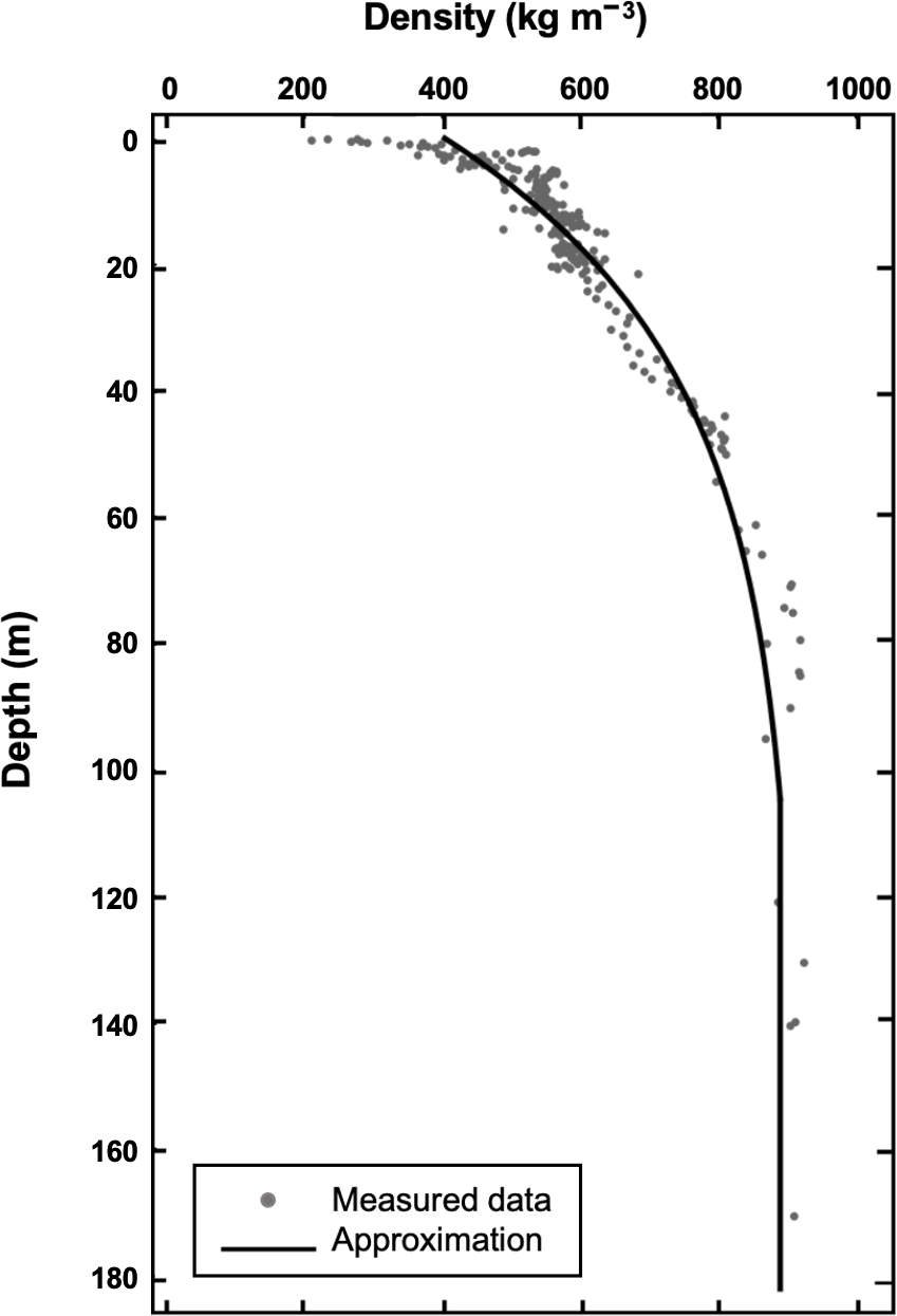 Based on an approximation of the density distribution in the 2009 ice core, the ice/firn density in the glacier is represented as a function of depth (Fig. 3) as follows: