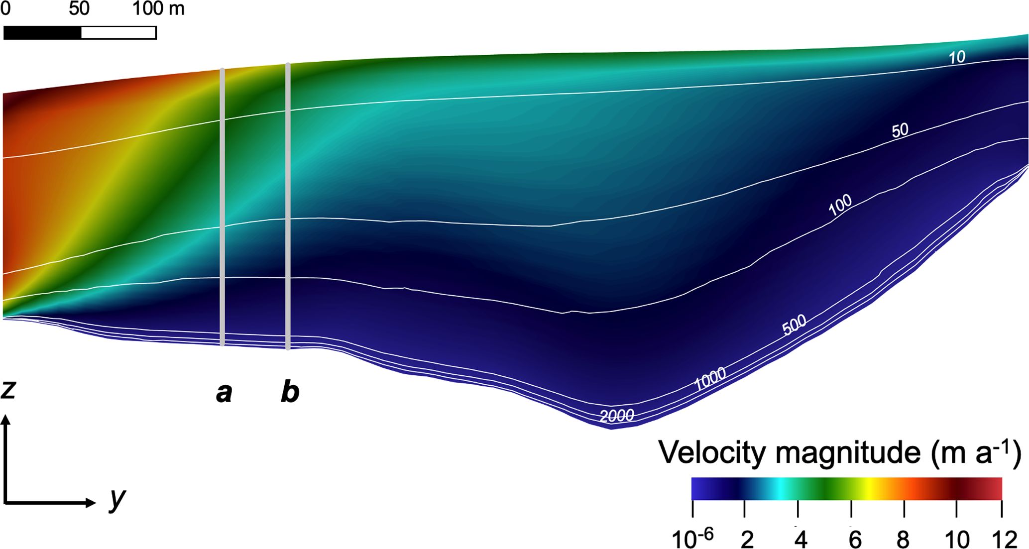 Figure 4 illustrates the simulation results for a purely mechanical model without lateral outflow, showing the velocity magnitude and isochrones in the vertical section passing through the 2009 drilling site. The velocity of ice/firn in this section reaches its highest values (about 12 m a−1) near the southern boundary of the computational domain, due to the tangential (to the vertical ”wall”) component. The lateral boundary condition in this simulated case sets the normal velocities to zero, while the tangential velocities remain unconstrained.