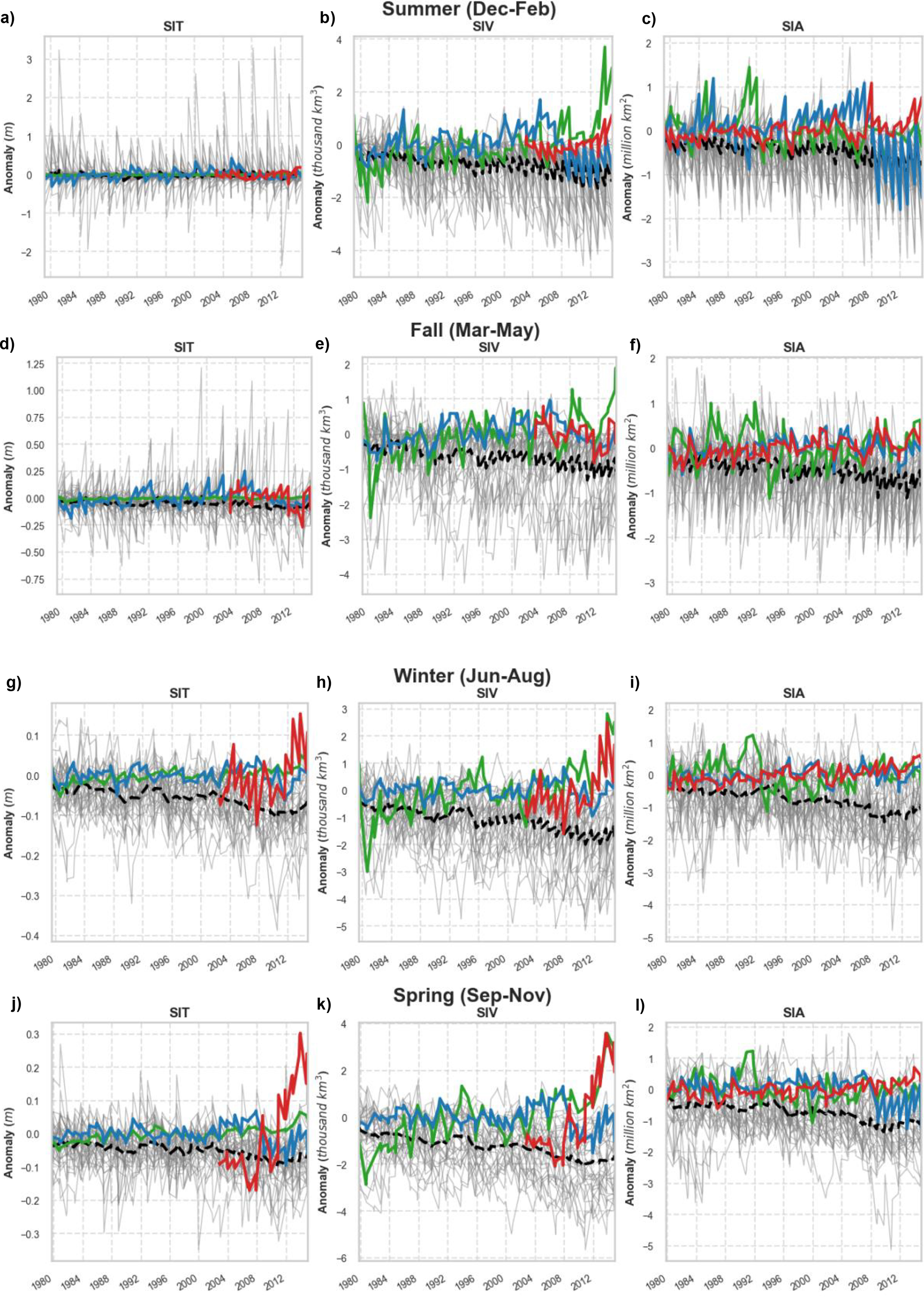 Figure 2Anomalies for four seasons: Summer and Fall (Warm Seasons; a–f), Winter and Spring (Cold Seasons; g–l) of SIT (left), SIV (middle) and SIA (right) of the circumpolar Antarctic. All the CMIP6 models are shown as grey lines, Multi-model mean in dashed line, GECCO3 in blue, GIOMASS in green, and NSIDC/ Envisat-CS-2 in red. All the sea-ice products extend for the time-period 1979–2014 except for satellite products which are only available for 2002–2014.
