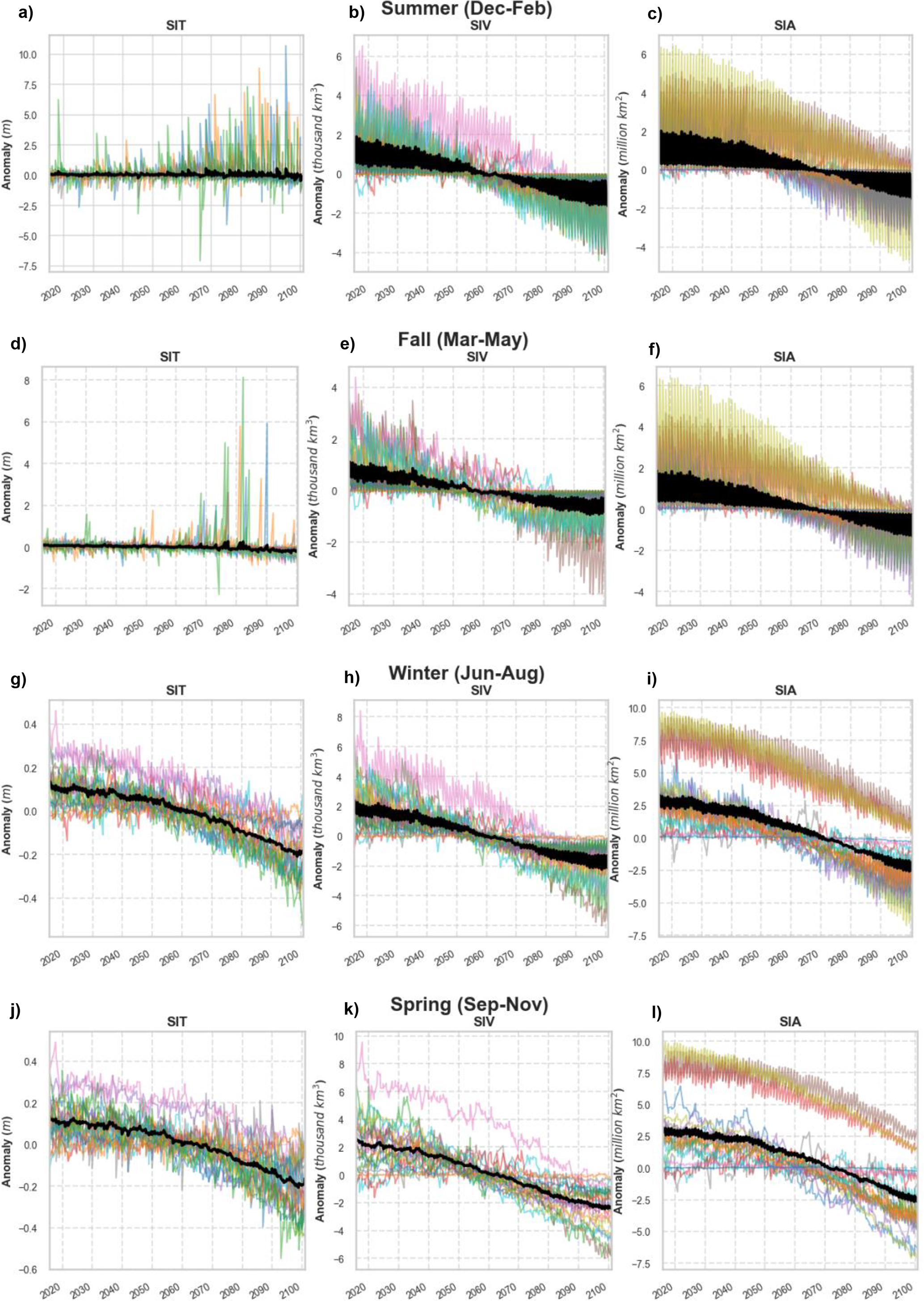 Figure 3Anomalies for four seasons: Summer and Fall (a–f; Warm Seasons), Winter and Spring (g–l; Cold Seasons) of SIT (left), SIV (middle) and SIA (right) of the circum-Antarctic. All the CMIP6 models are shown as colored lines, and the Multi-model Mean in black line. The time-period is 2015–2100 for the SSP5-8.5 scenario. Since sea-ice products end in 2014, they could not be included here. Note that 3 models (namely ACCESS-CM-2, ACCESS-EM2-1 and CESM2-WACCM show slightly higher anomalies (especially for SIA), particularly evident during the cooler seasons (i, l).