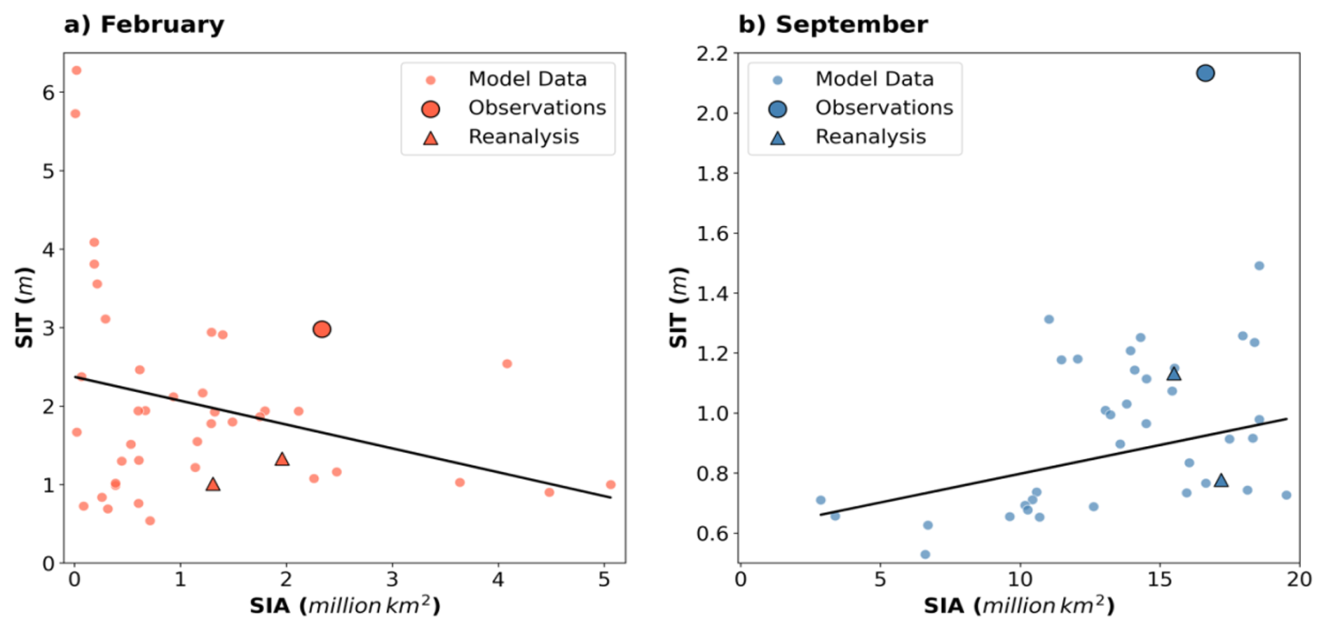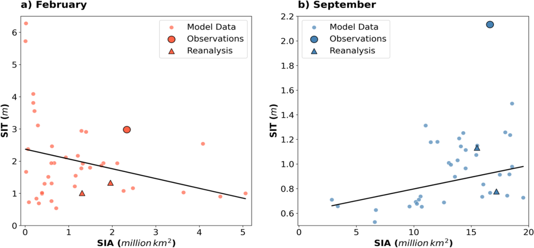 Figure 5 also highlights how simulated SIA and SIT are differently related depending on the time of year (also evident in Figs. 2–3). In summer, SIA and SIT biases are negatively correlated (Fig. 5a; although we note that many models have very low SIA in February), and in winter they are positively correlated (Fig. 5b). One possible way to explain this is that models with strong melt seasons result in low summer sea-ice cover in which only the thickest ice can survive. The reverse may be true for weaker melt seasons which may allow more, and thinner, ice to survive, leading to greater SIA made up of thinner ice. In winter, greater sea-ice freezing will lead to both thicker ice and a larger area, explaining the positive relationship between the SIA and SIT biases in Fig. 5b. This contrasting seasonal relationship raises questions about whether SIA is a reliable predictor of SIT, which has significant implications for our understanding of sea-ice changes when based solely on SIA. Further studies are needed to clarify this.