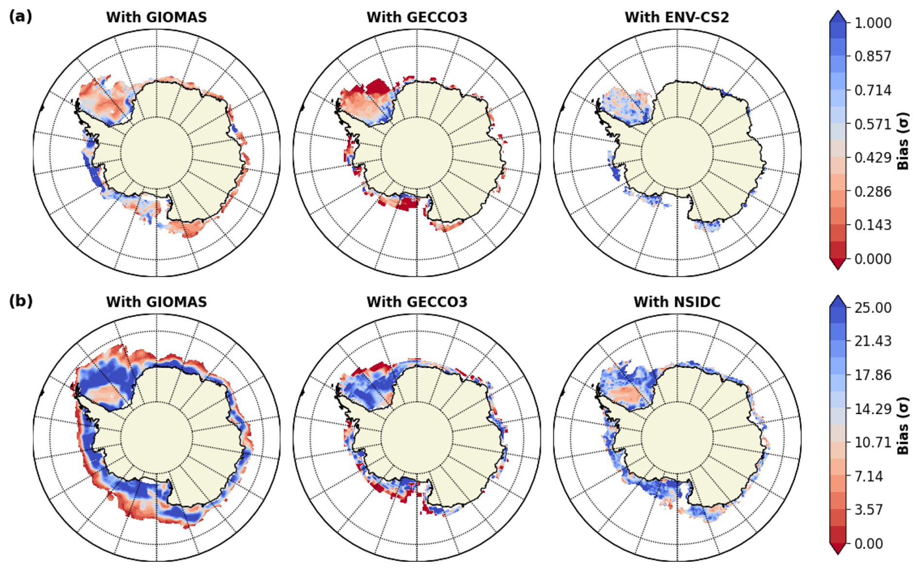 Model parameter tuning can also impact thickness. Sea-ice models are often tuned to get realistic ice extent or concentration, which can indirectly affect SIT. For instance, adjusting albedo or ice strength to match observed ice area might cause models to grow ice either too thick or too thin as a side effect. Similarly, the GIOMAS reanalysis (with ∼ 0.8° grid and concentration assimilation) is also known to underestimate thickness in deformed ice areas, partly due to smoothing and assimilation removing thick ice (Liao et al., 2022). This underestimation is echoed in many CMIP6 models. Studies of Arctic sea-ice in models have shown that tuning ice strength and improving ice drift physics can reduce biases in ice thickness and extent. In the Antarctic, this means capturing features like the persistent Weddell Gyre (which retains most of the multi-year ice) and properly accounting for wave-induced ice break-up and floe size effects in the outer pack. Improving sea-ice dynamics in models (ridging parameterizations, drag coefficients, and interactions with ocean currents) is essential for simulating the observed thick ice in convergence zones. Model biases in atmosphere or ocean state can also translate into SIT biases, depending on how the sea-ice model is tuned. Therefore, diagnosing thickness biases requires careful attention to model configuration: ice strength parameters, snow thermal conductivity, melt pond and albedo schemes (both in the Arctic and Antarctic), and ocean mixing coefficients all may be tuned to some degree. Going forward, studies recommend reducing the need for ad-hoc tuning by improving physical realism– for example, ensuring accurate coupling of ice with atmosphere/ocean momentum and heat fluxes (Nie et al., 2023). In Arctic simulations, better coupling (e.g. improved ice–ocean drag and air–ice drag) was shown to reduce sea-ice bias, which may apply in the Antarctic as well.