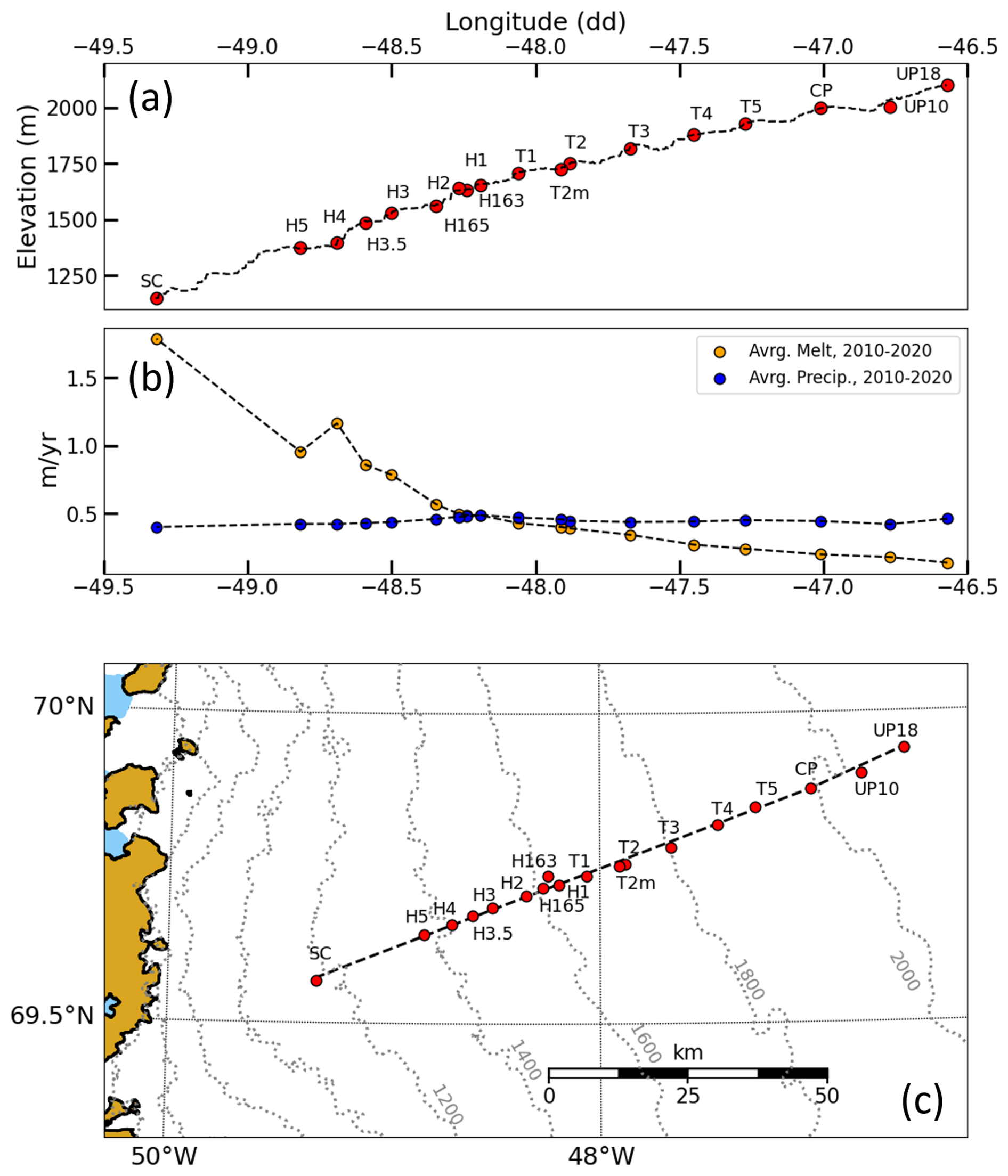 Figure 1Study area. (a) Elevation profile, (b) annual melt and precipitation amounts, and (c) plan-view map of sites in the study area. SC (Swiss Camp) is not a part of this study but is the lowest elevation site on the EGIG. Precipitation and melt data were averaged from year-resolution RACMO datasets from 2010–2020.