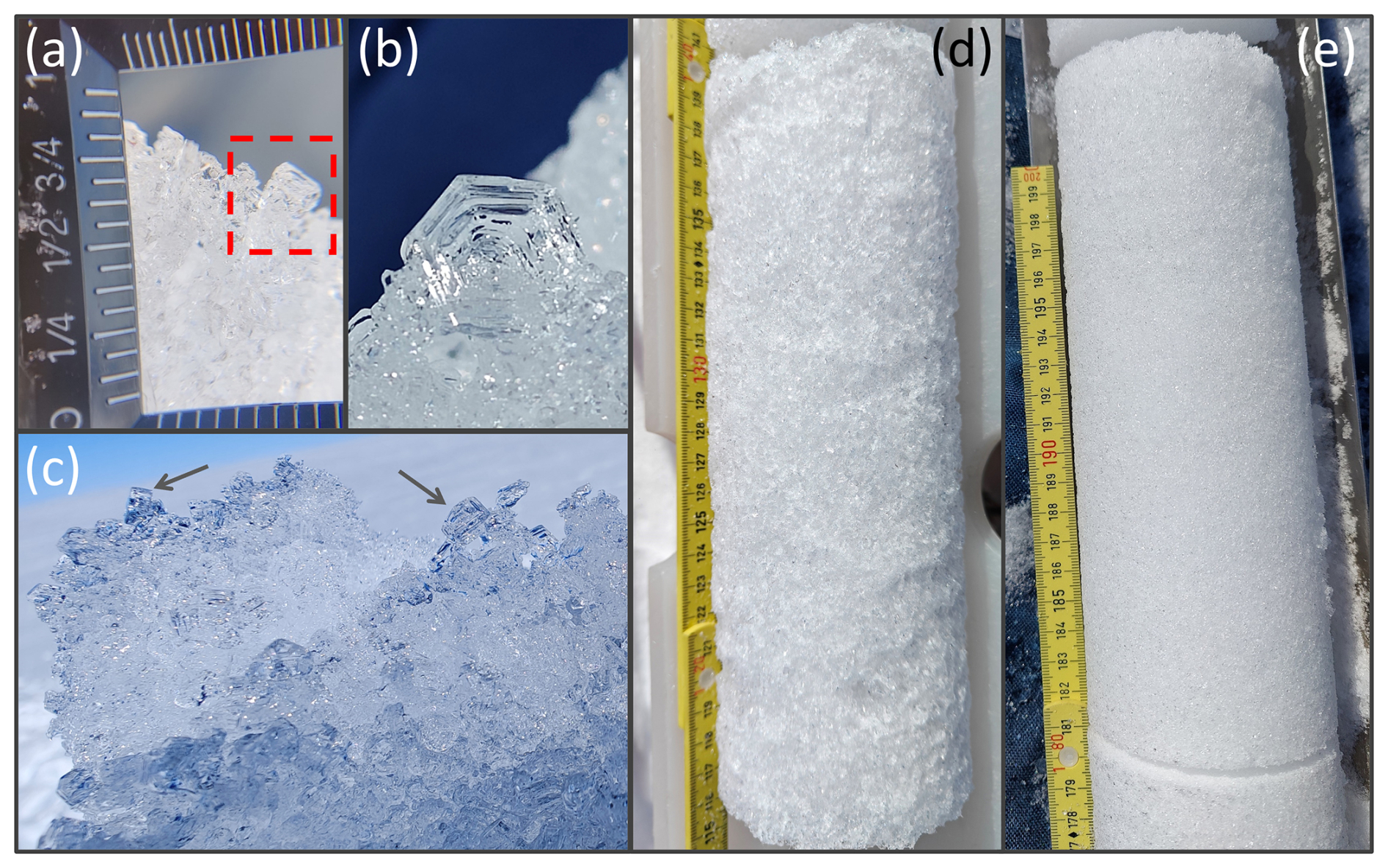 Figure 2Photographs of faceted grains. (a) Square, faceted firn grain observed at site T3-1818m at 6.9 m depth, spring 2022. The straight, upward-facing edge of the grain within the red dashed box measures ∼3–4 mm in length (see scale). (b) Depth hoar grain observed at site CP-1998m at 1.5 m depth, spring 2024. The grain was located beneath the previous year's summer melt surface, with an estimated grain size of ∼4 mm. This grain shape represents an end-member kinetic growth form. (c) Example of friable, faceted grain clusters pulled from a core section. Arrows point to two square, faceted grains. (d) Coarse, faceted firn grains within a rough, bumpy core section (site CP-1998m, spring 2023, 11 m depth), compared to (e), fine, ∼1 mm diameter rounded firn grains in core section (site CP-1998m, spring 2022, 10 m depth).