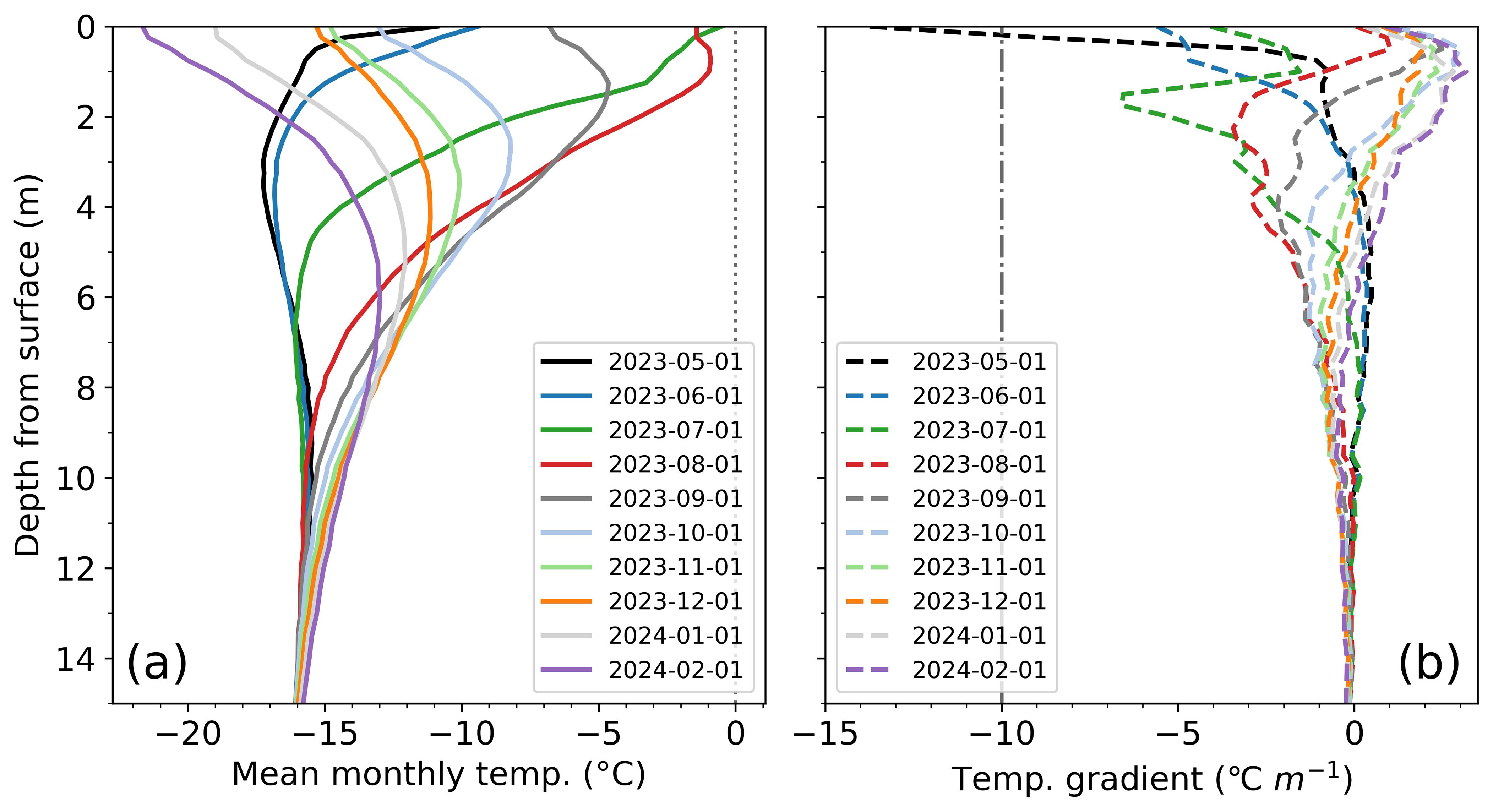 Figure 5Example of a seasonal firn temperature cycle at site CP-1998m (May 2023–February 2024). (a) Mean monthly temperature profiles and (b) temperature gradients calculated from monthly means. Profiles in (a) and (b) were assigned first-of-month dates. The dotted line in (a) denotes 0 °C and the dashed-dot line in (b) the negative CTG threshold. Monthly average temperature gradients in (b) only surpass the CTG threshold in May (black line) near-surface.