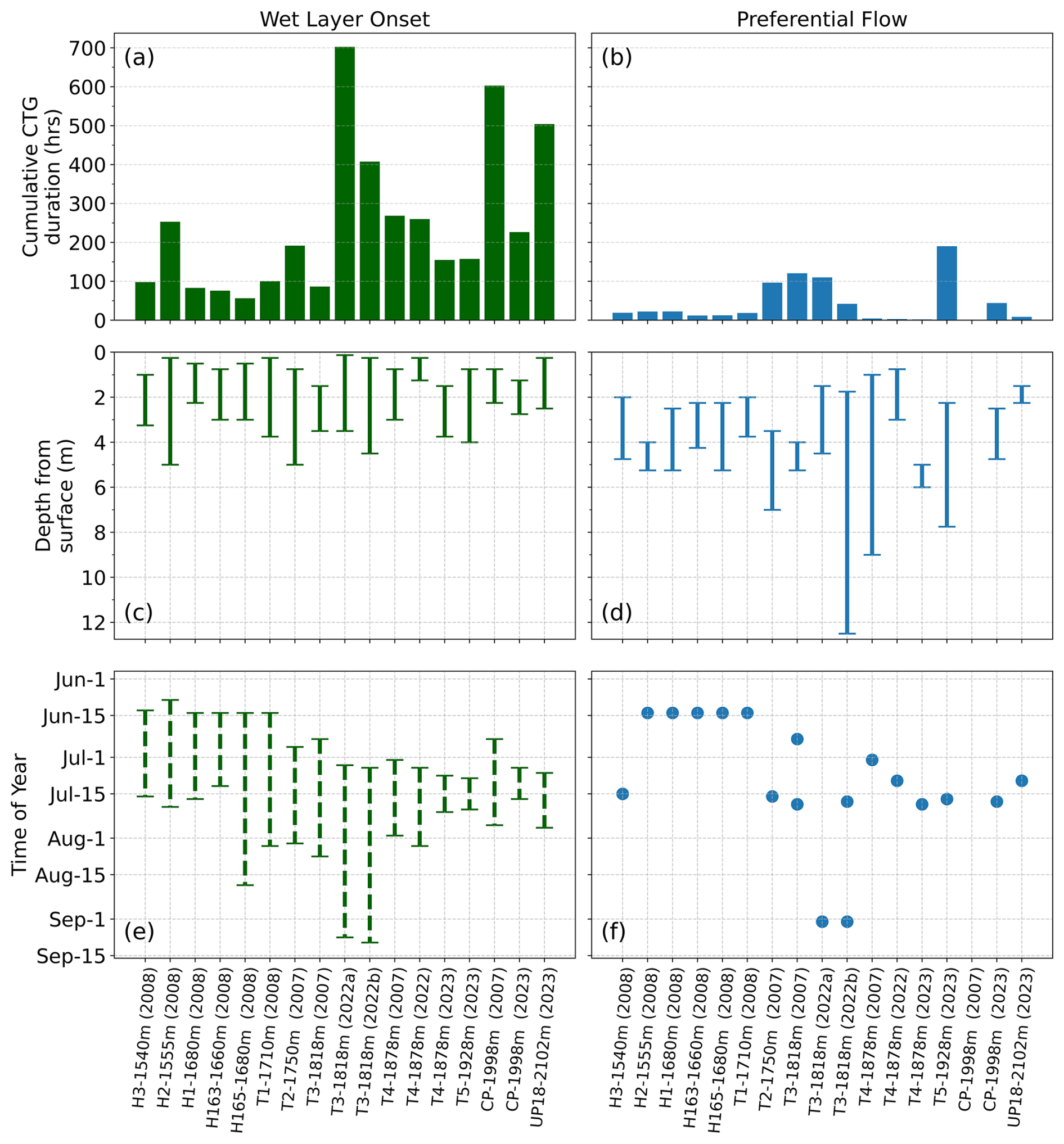 Figure 6Duration, timing, and depth characteristics of meltwater-induced faceting mechanisms, wet layer onset (left column) and preferential flow (right column), at each site (where observed). (a, b) Cumulative time that critical temperature gradients (CTGs) were observed at each site. (c, d) Range of depths where CTGs associated with mechanisms were observed. (e) Time periods where CTGs associated with wet layers were observed. (f) Dates where CTGs associated with preferential flow events were observed. CTG durations are reported as observed and were not normalized as to emphasize the variability of kinetic growth conditions.