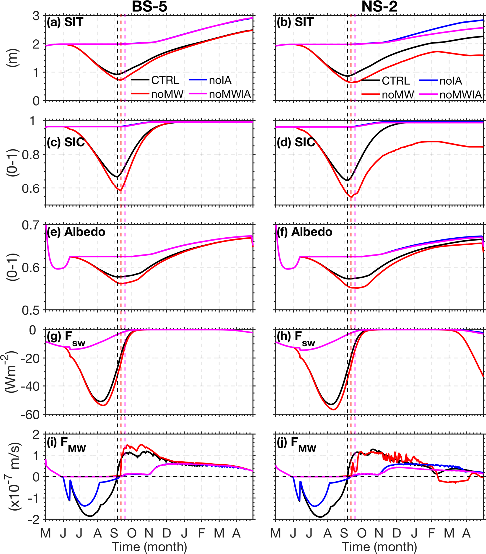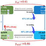 noMWIA. based on the noIA configuration but setting SIMW flux to zero (Fig. 3d) to eliminate both ice-albedo feedback and SIMW feedback. As shown in Fig. 4, during the melting season, summer sea ice thickness, concentration and ice-albedo remain unchanged (Fig. 4a–f), and SIMW flux is zero (Fig. 4g–h).