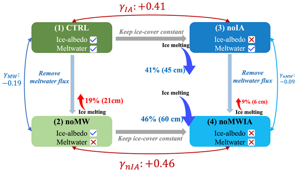 Additionally, our experimental design provides a framework to quantify the net effects of SIMW and ice-albedo feedbacks by preventing each from the influence of one another. The net ice-albedo feedback factor (γnIA) and the net SIMW feedback factor (γnMW):
