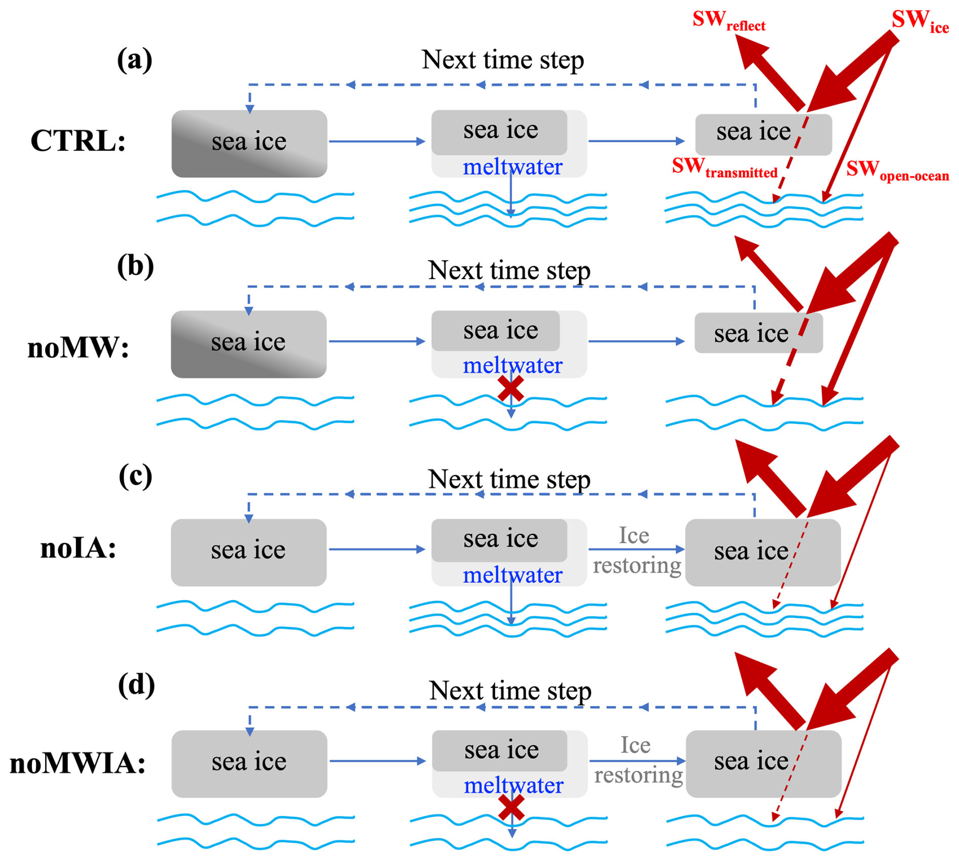 Figure 3Schematic representation of the four experiments in this study. (a): CTRL (Control experiment), with ice-ocean coupled model running normally; (b): noMW (no SIMW feedback experiment), after sea ice melting, the SIMW flux entering the ocean is set to 0; (c): noIA (no ice-albedo feedback experiment), after sea ice melting, SIMW enters the ocean normally, but before the model starts the next time step, sea ice is restored to its first melt-day state; (d): noMWIA (no ice-albedo feedback and SIMW feedback experiment), after sea ice melts, the SIMW flux entering the ocean is set to 0, and simultaneously, before the model starts the next time step, the sea ice is restored to its first melt-day state. The red arrows represent the shortwave radiation fluxes: SWice (Shortwave radiation reaching the ice surface), SWreflect (shortwave radiation reflected from the ice surface), SWtransmitted (shortwave radiation transmitted through sea ice to the ocean), and SWopen-ocean (shortwave radiation entering the ocean through open ocean).