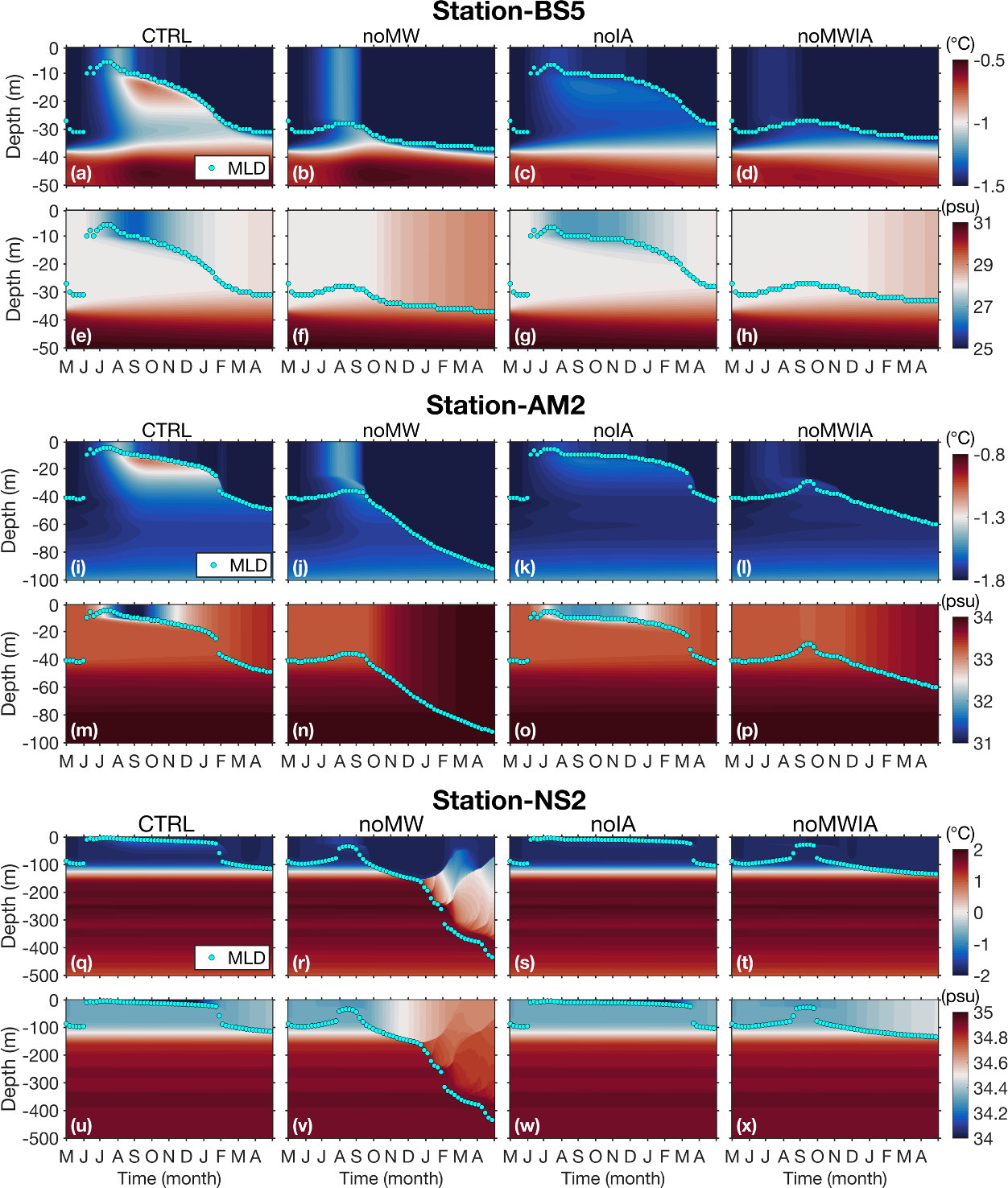 Figure 5Simulated vertical profiles of ocean temperature and salinity over time at stations (a–h) BS5, (i–p) AM2, and (q–x) NS2. For each station, the top row displays temperature, and the bottom row displays salinity. From left to right, the columns correspond to the CTRL run, noMW run, noIA run, and noIAMW run. Cyan dots in each panel represent the mixed layer depth. Note that the vertical depth scales are not consistent across stations.