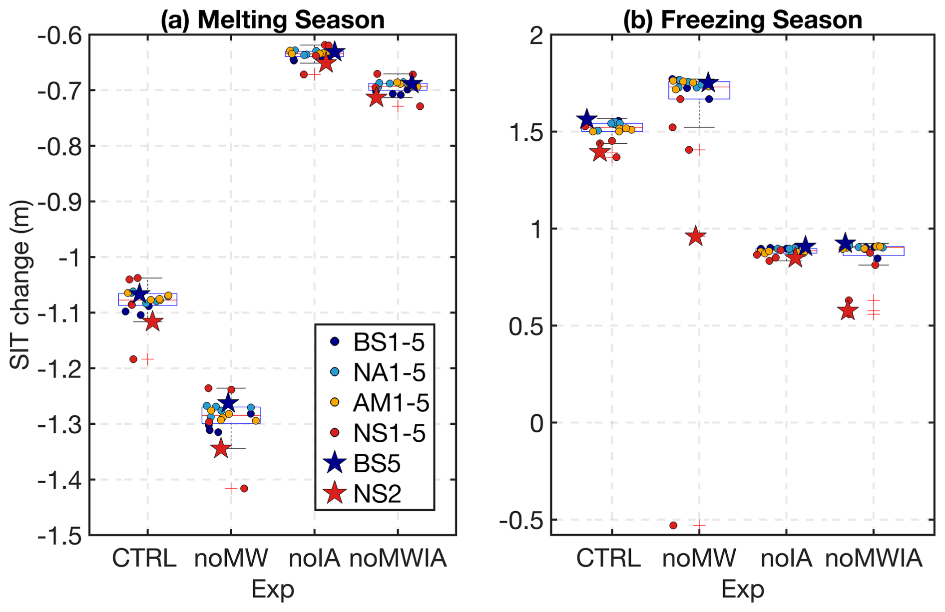 Figure 7Box plots illustrating the (a) ice thickness changes during the melting season and (b) freezing season across different stations in different types of experiments. Each box plot shows the median, interquartile range, and potential outliers (points marked with red plus sign). All points are the results of experiments with initial SIT of 2 m.