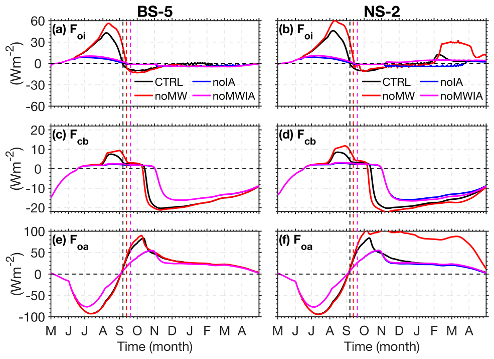 The influence of SIMW is further demonstrated by comparing the noMWIA and noIA experiments. As shown in Fig. 5b, the noMWIA run exhibits reduced sea ice formation in the NS2, NS4, and NS5 regions relative to the noIA run. In the absence of SIMW, weakened stratification intensifies winter convection and upward heat transport, increasing the ocean-to-ice heat flux (Fig. 8b) and thereby slowing ice growth in these regions (Fig. 4b). However, unlike the noMW run where strong winter vertical mixing and sea ice melt are observed (Figs. 4b and 5r), these phenomena do not occur in the noMWIA run. This discrepancy arises because the noMWIA experiment maintains summer sea ice cover unchanged, leading to thicker sea ice and a much smaller open ocean by the onset of winter. Consequently, both ice basal and oceanic heat loss proceed slowly (Fig. 8c–f), reducing the winter ice formation. The associated weakening of brine rejection further weakens the ocean vertical convection, which becomes insufficient to disrupt the pre-existing stratification. As a result, AWW cannot reach the surface (Fig. 5t), and winter ice melt does not occur (Fig. 4b) in the noMWIA run.