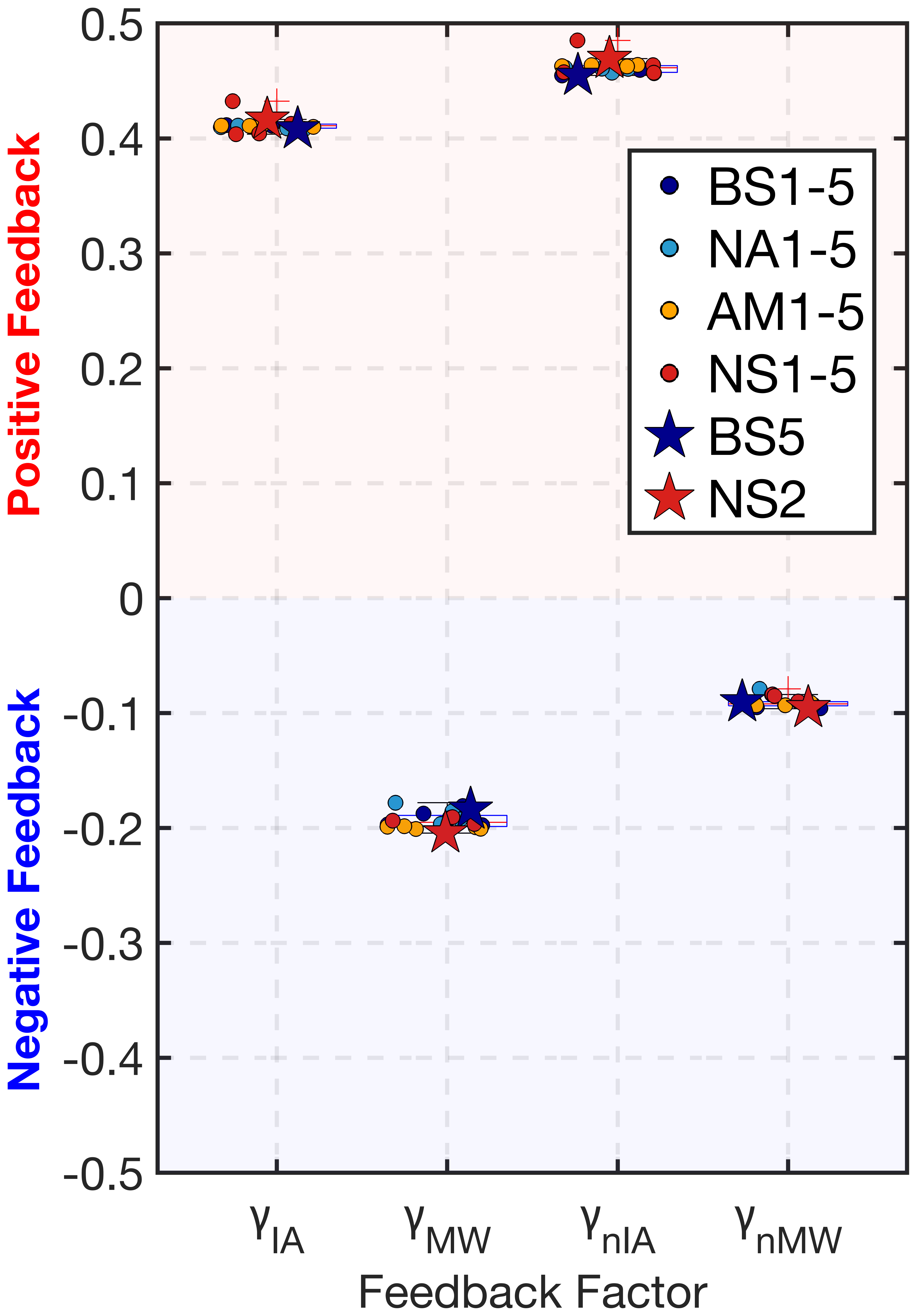 Figure 9Box plots illustrate the four feedback factors across different stations. If the γ is a positive (negative) value, it represents positive (negative) feedback. All points are the results of experiments with initial SIT of 2 m. The blue star and red star represent stations BS5 and NS2, respectively. Ice-albedo feedback Factor: γIA; SIMW feedback Factor: γMW; Net SIMW feedback factor: γnIA; Net ice-albedo feedback factor: γnMW.