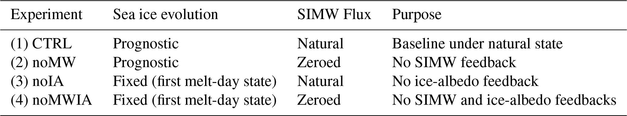 In addition, we also want to explore the net ice-albedo feedback and SIMW feedback. Therefore, we designed the following experiment: