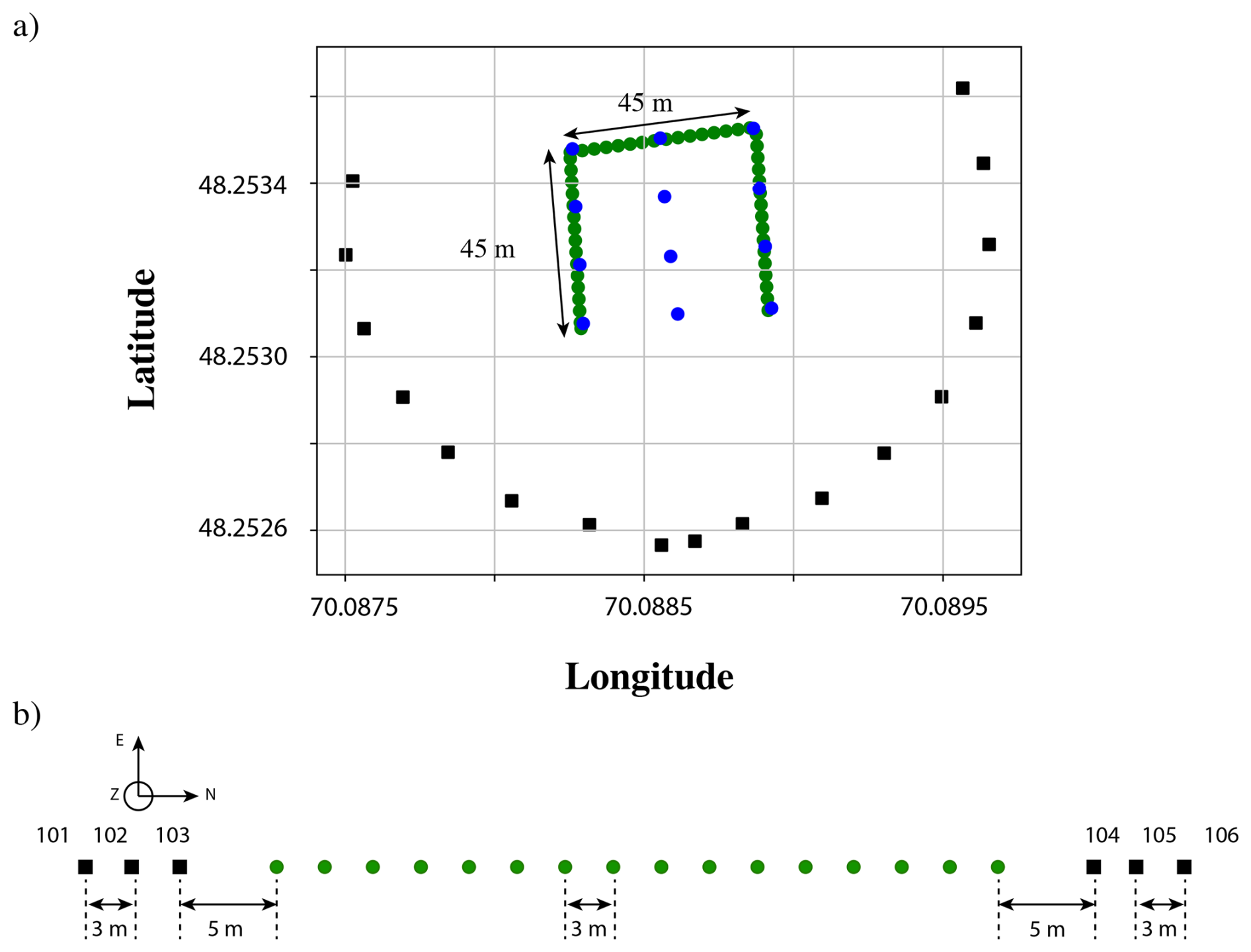 Figure 3(a) Map showing the geographical location of the geophones for the four acquisitions on 11 February 2024: three acquisitions using linear arrays with 16 geophones (green circles), and one acquisition using a squared array with 12 geophones (blue circles). (b) Relative positions of geophones within linear arrays with respect to the position of the active sources used on each side of the array. The six positions are numbered 101 to 106. Geophones are shown as circles while sources are shown as black squares.