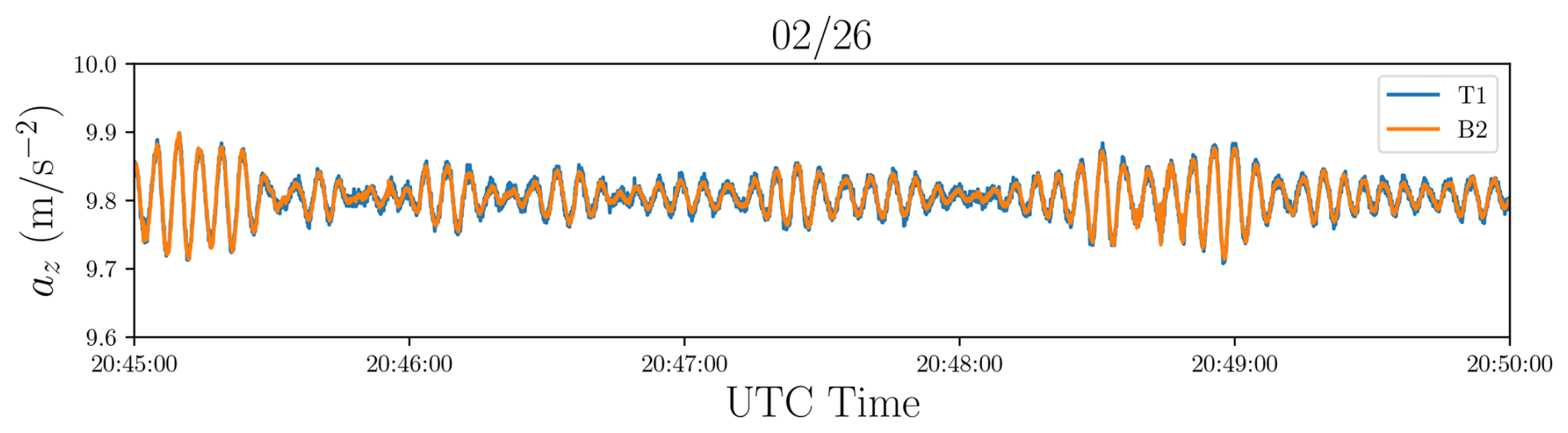 Figure 4Sample of the vertical acceleration az measured simultaneously by a wave-buoy (B2) and a smartphone (T1) on 26 February 2024. The comparison shows quantitative agreement.