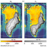 The large GrIS in LG is stable due to the expansively glaciated terrain, with peaks of over 3000 m and its highly reflective surface (Figs. 1a and 2). These cause a locally cold climate with an average annual temperature of about −17.8 °C and a minimum temperature in winter of on average −26.7 °C (Fig. 3a). The high orography blocks synoptic storm systems approaching Greenland from the west (Dethloff et al., 2004; Andernach et al., 2025). Deflected on a more southerly trajectory, the storms move along the southern tip of Greenland, where they can cause precipitation. Additionally, the high topography along Greenland's southeastern coast plays a crucial role in generating orographic precipitation on the windward side of the mountains, driven by moist easterly onshore winds (Fig. 4a; Ohmura and Reeh, 1991). Hence, accumulation is highest in southern Greenland, where the regions of maximum precipitation and high orography are located (Figs. 3i and 5a). As surface ablation is confined to the low-lying areas along the coast (Fig. 5e), the SMB is positive over the majority of the ice sheet (Fig. 5i).