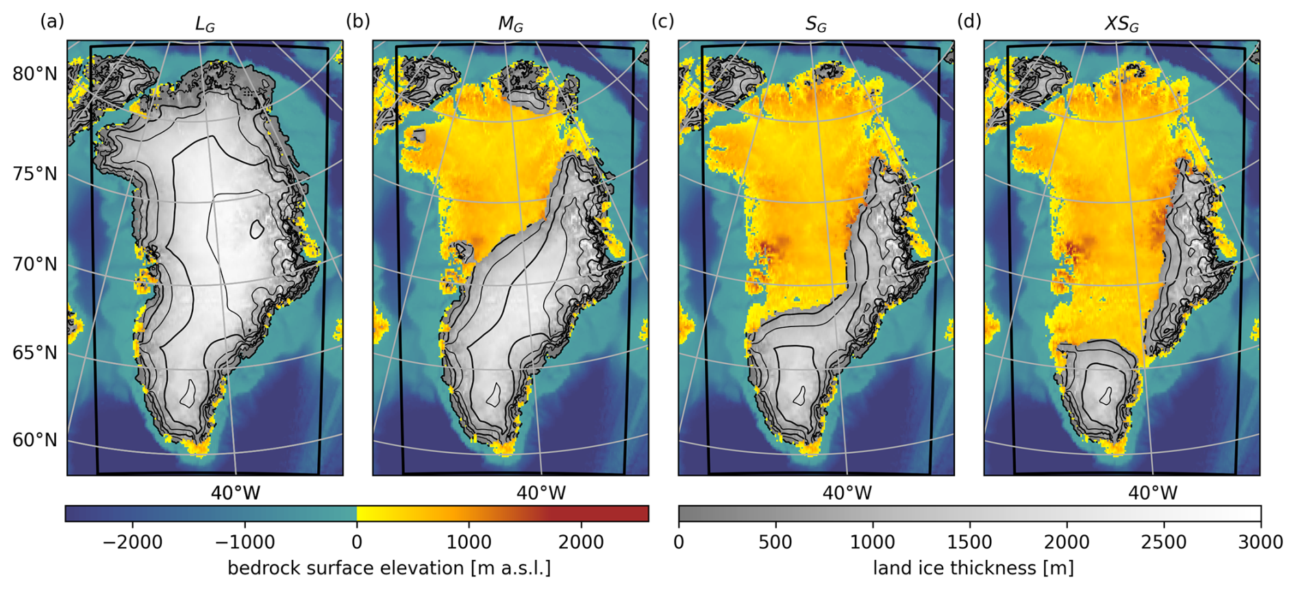 Initialized from different initial ice sheet volumes (Fig. A1a–j), we obtain four steady states of the GrIS (Fig. 1): a large, a medium, a small and a very small state (LG, MG, SG and XSG, respectively). LG corresponds to the PI state with a maximum ice thickness of about 3200 m in eastern Greenland (Fig. 1a). In LG, the GrIS holds an ice volume of about 3.0 × 1015 m3, corresponding to 7.3 m of sea-level equivalent (SLE). In XSG, the GrIS is split into two separate parts that are confined to the eastern and southern mountain ranges, reaching elevations of up to 2600 and 1600 m, respectively (Fig. 1d). The eastern part grows to a maximum ice thickness of 2300 m, while the southern part has a maximum ice thickness of about 2000 m. The GrIS in XSG retains 20 % of its PI volume, equivalent to about 0.6 × 1015 m3 or 1.4 m SLE of ice. In the next larger state SG, the southern and eastern parts of the ice sheet are connected by a narrow stretch of ice and form one single small ice sheet (Fig. 1c). In SG, the GrIS has a maximum thickness of about 2400 m. Its final volume amounts to about 30 %, which corresponds to 0.8 × 1015 m3 or 2.1 m SLE. In the last state MG, a medium-sized ice sheet is present with a final volume of about 50 %, equivalent to 1.4 × 1015 m3 or 3.5 m SLE (Fig. 1b). Compared to SG, the ice sheet in MG extends further northwest into central Greenland. Its maximum ice sheet thickness is about 2600 m. Additionally, small ice caps cover parts of northern Greenland.