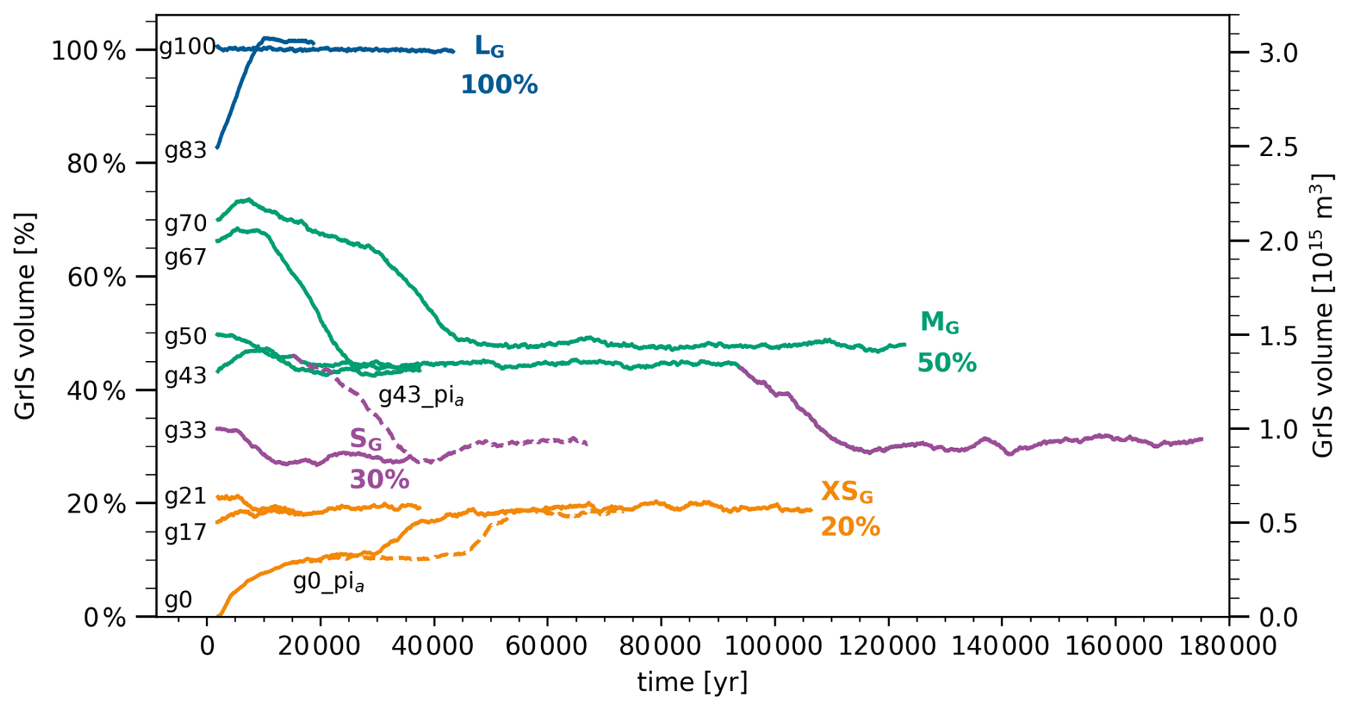 Aiming to study the existence of potential multiple steady states of the GrIS, we performed ten simulations that started from different GrIS volumes (0 %, 17 %, 21 %, 33 %, 43 %, 50 %, 67 %, 70 %, 83 % and 100 % of the PI value). These were run until equilibrium under prescribed constant PI greenhouse gas concentrations (CO2 of 282.59 ppm, CH4 of 711.09 ppb and N2O of 270.28 ppb; Köhler et al., 2017) and orbital parameters (Berger and Loutre, 1991). Figure A1a–j in the Appendix displays the initial ice thickness map and the initial volume of each simulation.