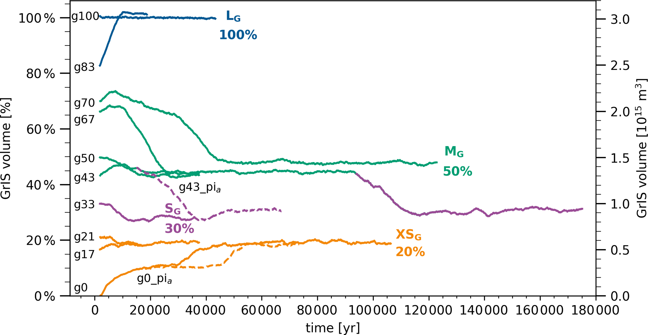 Figure 2Time series of the GrIS equilibrium simulations and their final steady states given as end volume with respect to the PI volume in percent. Solid lines indicate the steady-state simulations performed with interactive ice sheets in the Northern and Southern Hemisphere. Dashed lines show the same experiments but performed with a prescribed PI AIS from g100. Each color corresponds to one steady state. The change in the color of g43 indicates a state transition that is further explained throughout the text. The simulations used to study the climate conditions constraining each state displayed in Fig. 1 are highlighted with the steady state's name and equilibrium volume. Maps of the initial GrIS and AIS volumes are illustrated in Figs. A1 and A2 in the Appendix.