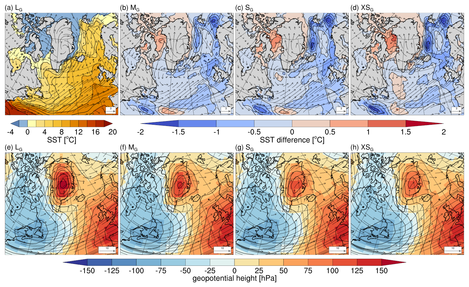 Figure 4(a–d) Absolute annual mean 10 m winds (vectors, m s−1) overlaid on SST. (a) shows absolute SST from LG, (b–d) the difference in SST between MG, SG and XSG with LG, respectively. (e–h) DJF normalized geopotential height (contours) and flow direction (vectors, m s−1) at 500 hPa.