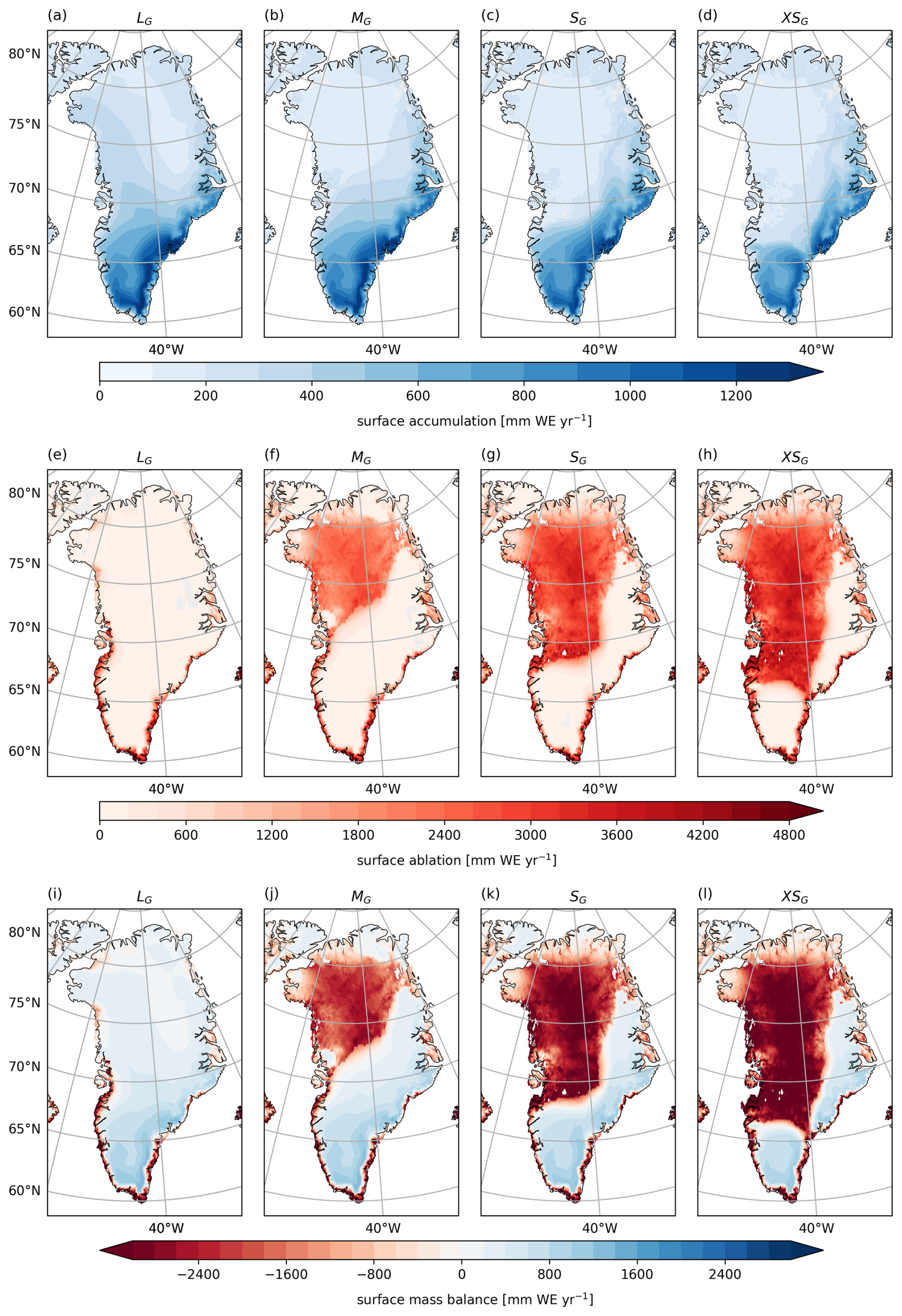 Started from a completely disintegrated state (Appendix Fig. A1a), the GrIS regrows in the regions in the south and east of Greenland (XSG) due to their favorable climatic conditions, including temperature and precipitation. The east of Greenland receives more precipitation than with a large GrIS as the atmospheric flow is less deflected by the lower orography of the smaller GrIS (Fig. 3l). As a consequence, moist air masses and storm tracks penetrate deeper into Greenland (previously shown by Andernach et al., 2025), where they eventually precipitate on the windward side of the mountain range to the east of Greenland. This is reflected in a more homogeneous distribution of precipitation, with lower precipitation in the south and west of Greenland, but higher precipitation in the northeast in XSG. The weaker Greenland Anticyclone (previously shown by Andernach et al., 2025), in response to the reduced mechanical blocking and the higher near-surface air temperatures in the predominantly low-elevation areas of Greenland (Fig. 3d and h), further reduces the advection of moist air masses to southern Greenland. Hence, surface accumulation is lower in Greenland's south and west in XSG than in LG (Fig. 5d). Nevertheless, the southern and eastern regions continue to receive the highest annual precipitation, due to orographic effects and the proximity to the core of the storm track located south of Greenland. Only in the mountains are temperatures cold enough to preserve the snow throughout the year (Fig. 5h and l), which eventually favors the nucleation of a new ice sheet.