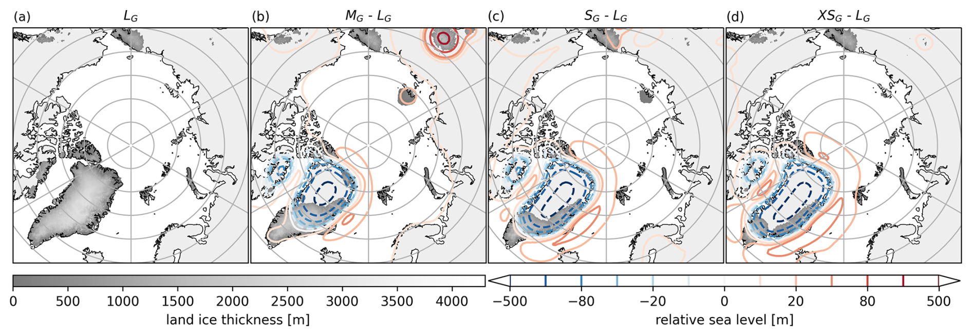 Figure 6Effect of glacial isostatic adjustment (GIA), shown as the relative sea level, and ice sheet thickness for each steady state. The left column displays the absolute values of LG. The remaining columns show the difference in relative sea level of each state compared to LG, depicted as colored contour lines, ranging from lower sea levels (blue) to higher sea levels (red). Gray filled contours show the ice-sheet thickness of each state.