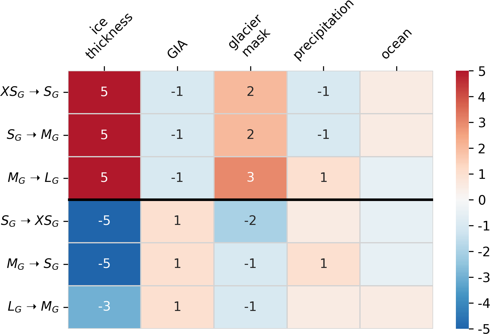 Figure 7Contribution of the different feedbacks and processes between the GrIS and the climate system to stabilizing the steady states. The number and associated color indicate the magnitude of the contribution of the respective factor to stabilizing (negative number and blue) or destabilizing (positive number and red) a GrIS state. It is calculated as the spatially-averaged difference between the SMB field of each steady state and the SMB field of this state including the indicated feedback based on its neighboring GrIS state in Appendix B (e.g., SMB of XSG minus the SMB calculated under the climate of XSG but with the precipitation scaled to the precipitation field of SG). The spatial averages are computed for the non-overlapping area between the two different glacier masks in central Greenland (solid and dashed lines in Appendix Figs. B1 and B2), excluding scattered coastal grid cells. Boxes without numbers indicate that the contribution is small. The upper half of the table shows the contributions for a transition from a smaller into a larger GrIS state and the bottom half of the table for a transition from a larger into a smaller GrIS state. The intervals used for scaling are: 0–50 (boxes without numbers), 51–500 (−1), 501–1000 (−2), 1001–1500 (−3), 1501–2000 (−4) and > 2000 (−5) for negative feedbacks and mirrored for positive feedbacks. Note that glacier mask also includes the albedo feedback.