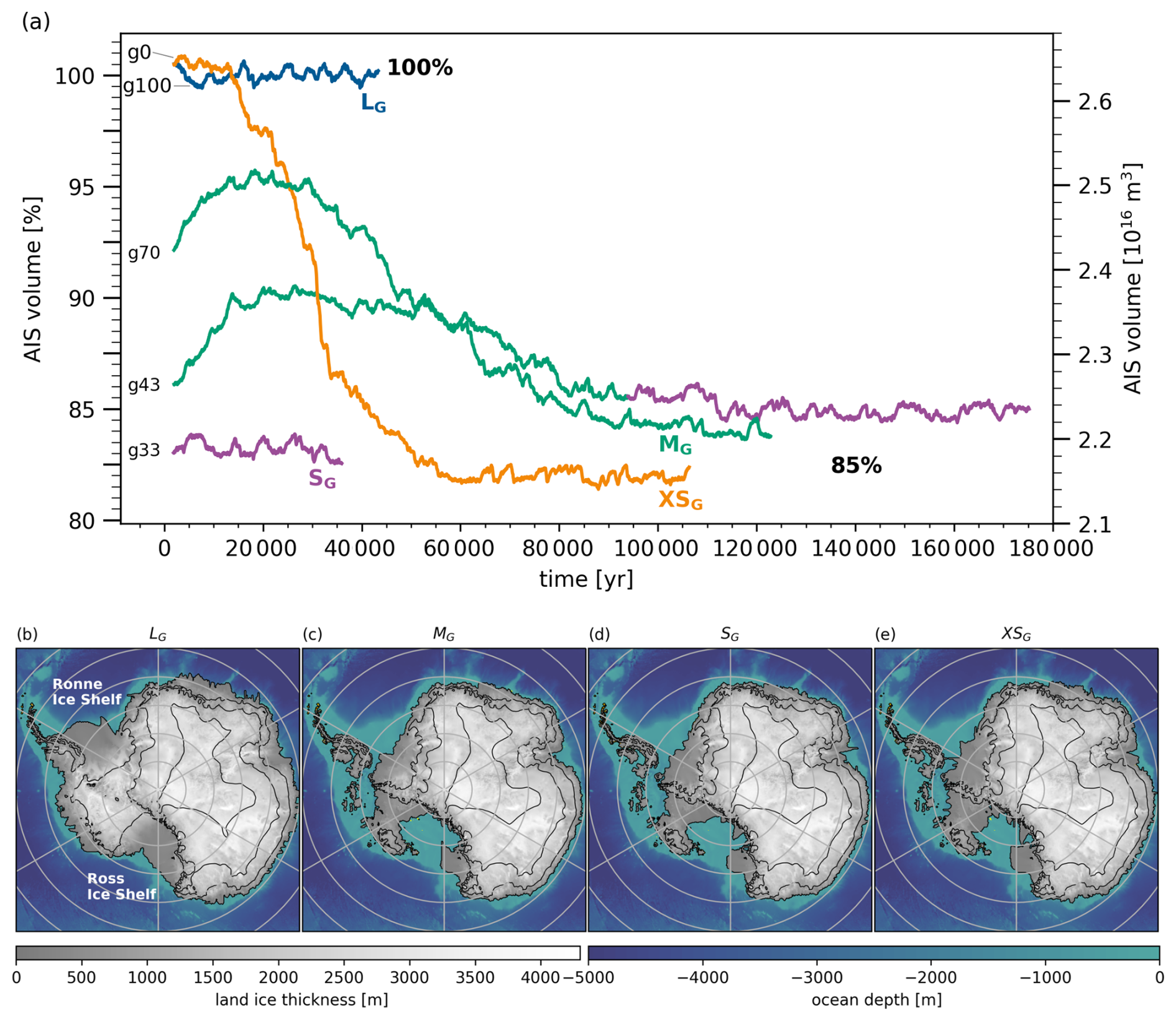Figure 8(a) Time series of ice volume of the AIS in the simulations selected to study the climate conditions of the GrIS's steady states in Sect. 3.1 and in simulation g43. The colors correspond to the colors of the GrIS's steady state in Fig. 2. The change in the color of g43 indicates when the GrIS transitions from MG into SG. (b–e) Maps of ice thickness of the AIS in the selected GrIS steady-state simulations. Maps of the initial AIS volumes are illustrated in Fig. A2 in the Appendix.