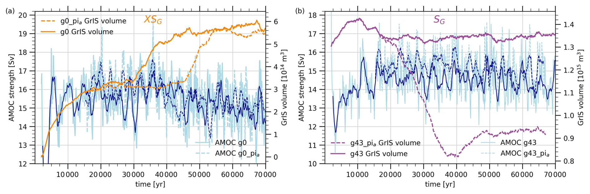 Figure 9AMOC strength and GrIS volume during GrIS state transitions in simulations with an interactive AIS (solid lines) and a constant PI AIS (dashed lines). (a) shows the effect of AIS dynamics on the simulation g0, which is stable at XSG, and (b) on the simulation g43, which eventually stabilizes at SG. Note that the ice volume is plotted as 10 year means, whereas the AMOC is plotted as 100 year means due to the asynchronous coupling method. The dark blue lines show the AMOC smoothed with a moving window of n=10.