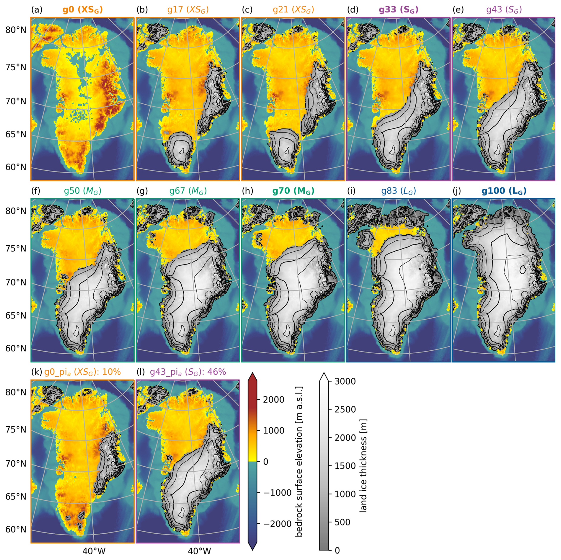 Figure A1Maps of GrIS ice thickness used as initial GrIS in the experiments described in Sect. 2.2 overlaid on the surface bedrock in meters above sea level () for the respective state. The first and second row show the initial GrIS in the ten main simulations. Experiment names indicate the initial GrIS volumes (e.g., g43 was initialized with a GrIS volume of 43 %). The last row shows the initial GrIS in the sensitivity experiments, which were branched off g0 and g43 and run with a prescribed PI AIS. Colors of the titles, state names in parentheses and frames refer to the final steady states in Fig. 2. The simulations used for the main analysis of the steady states are highlighted in bold font.