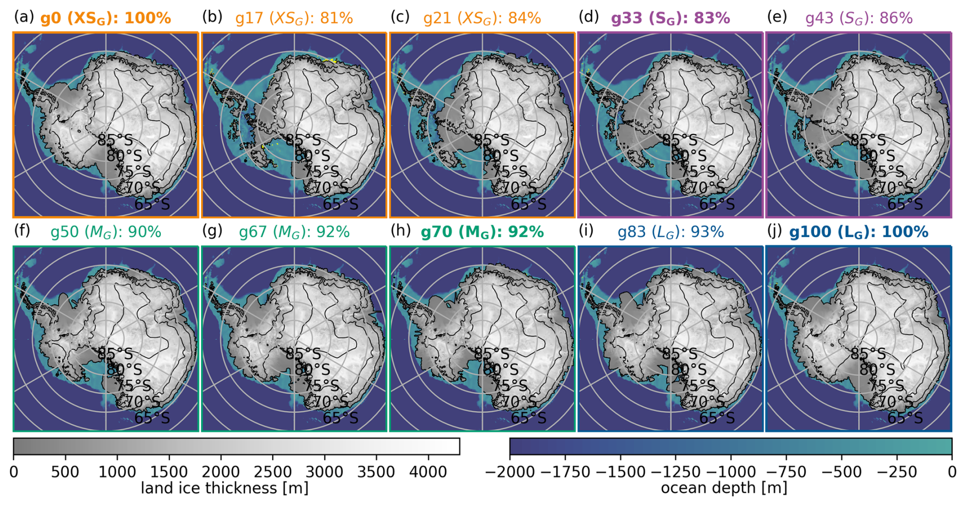 The simulation started at 100 % is an equilibrium run with a steady-state PI GrIS and PI AIS that was initiated from an equilibrated asynchronous fully-coupled spin-up simulation. Note that the PI state of both ice sheets is similar to PD. This simulation is referred to as g100, where “g” refers to the GrIS and “100” indicates its initial volume, and serves as reference PI simulation. The GrIS volume in g100 is only 1.7 % larger than the volume obtained from the IceBridge BedMachine of the NASA National Snow and Ice Data Center (NSIDC) Distributed Active Archive Center (Morlighem et al., 2022). In the simulation with 0 % initial GrIS volume (g0), we initially removed the GrIS in g100 and let the underlying surface bedrock adjust isostatically. We continued the run until the GrIS reached a new equilibrium under PI CO2 that is significantly smaller than its PI volume. The remaining initial GrIS volumes were obtained by branching off simulations at different volumes from a run in which this small GrIS in g0 continued to regrow under progressively decreasing CO2 concentrations. We continued these simulations under PI CO2 concentrations until reaching a new equilibrium or converging to the steady state of another equilibrium simulation. In all simulations the bedrock adjusted interactively to the changing ice sheets. Note that the bi-hemispheric model set-up allows for changes in the AIS. Hence, responding to the changes of the GrIS, the AIS also changes significantly. The initial ice distributions of the AIS are illustrated in Fig. A2 in the Appendix.