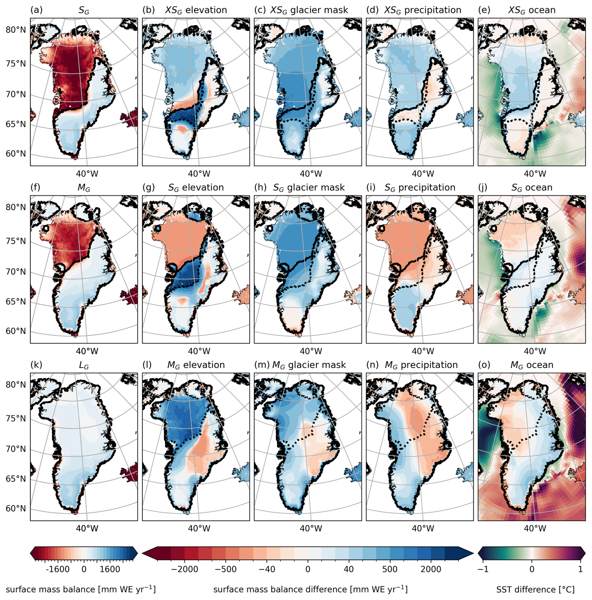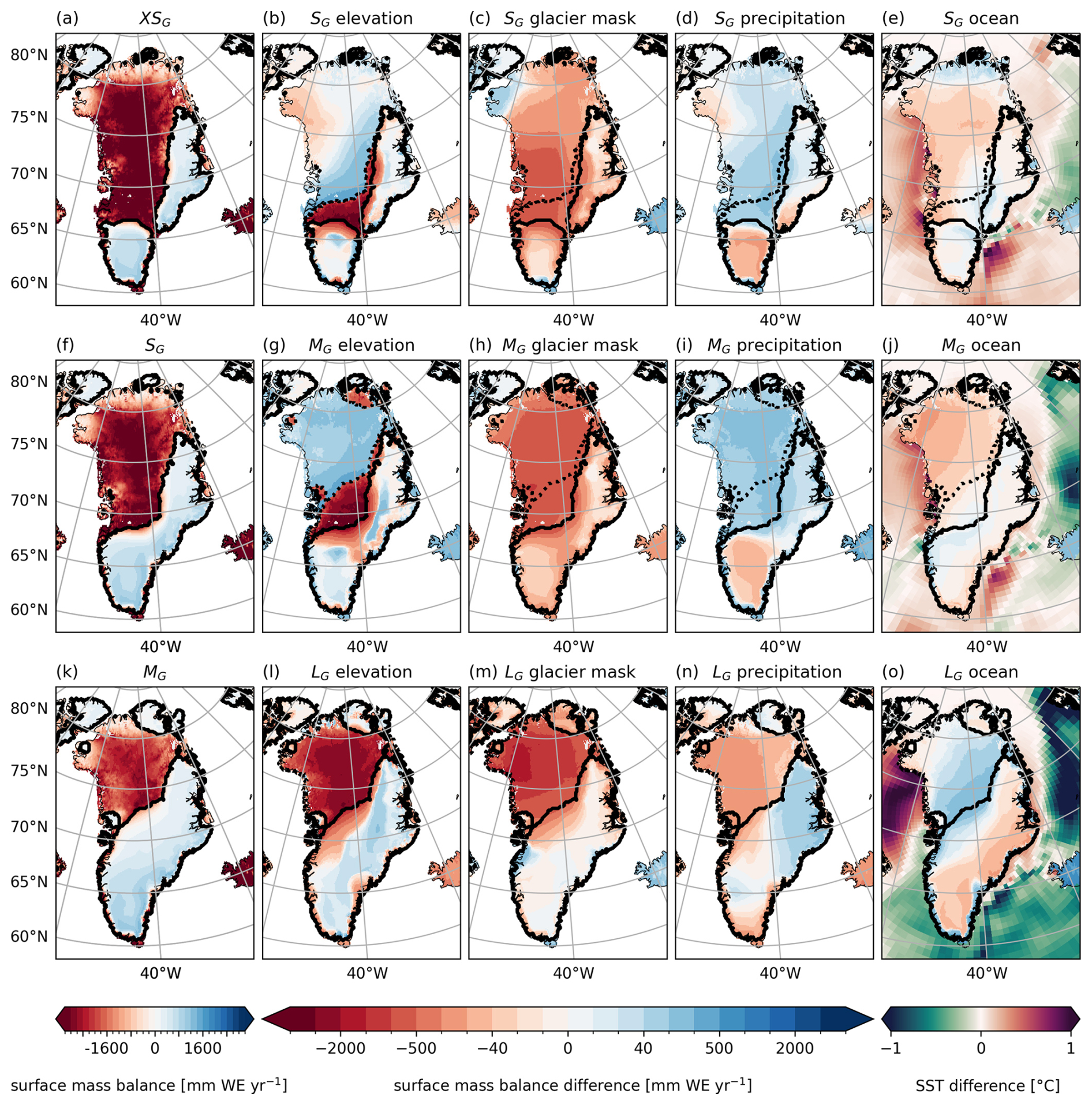 But how important is each of these described feedbacks and processes for the stability of the GrIS states? Figure 7 summarizes the contribution of each feedback, based on the figures in Appendix B. The figure indicates, for instance, that the GrIS in SG is stable mostly due to the impact of the surface elevation feedback. As explained in Sect. 2.2, the surface elevation effect is composed of the effect of the ice thickness and the counteractive GIA. In SG, the surface elevation is significantly lower over large parts of Greenland than in MG, due to the smaller ice sheet and associated lower ice thickness. Although uplift through GIA counteracts the effect of the lower ice thickness, the net impact of these two feedbacks is destabilizing, as the ice thickness-induced elevation change is larger than the isostatic uplifting-induced elevation change. The combined glacier mask and surface albedo feedback further impedes an ice sheet expansion along the margins of the GrIS in SG, mainly by raising the surface ablation. On the other hand, the higher surface elevation and larger glacier mask than in XSG stabilize the GrIS in SG. Feedback with the precipitation opposes the elevation and glacier mask feedback mainly due a redistribution in the accumulation, similar to Fig. 3j–l. While the precipitation of SG favors ice-sheet expansion towards the north of Greenland, thus stabilizing the small GrIS, the redistribution reduces the SMB in the south of Greenland. For the transition from a small to a very small GrIS (SG→XSG), the redistribution of precipitation has a counteracting effect and destabilizes the GrIS in SG. The ocean feedback has the weakest impact on the stability of the small GrIS in SG. Warmer ocean conditions in the Baffin Bay and Irminger Sea compared to colder conditions in the Nordic Seas in SG than in MG (Fig. B1j) favor ice sheet growth in the west, but inhibit it in the east. Spatially averaged, feedback with the ocean thus contributes to impeding the shift of the small GrIS into the medium state. However, the ocean changes slightly contribute to preventing a retreat of the GrIS in SG, due to a cooling-related lower surface ablation in SG than in XSG (Fig. B2j). Although the ocean feedback has a smaller or even minor contribution compared to the elevation feedback, even these small contributions can be decisive for critical transitions of the ice sheet, as explained in the preceding analysis, and should therefore be included in analyses of the stability of the GrIS.