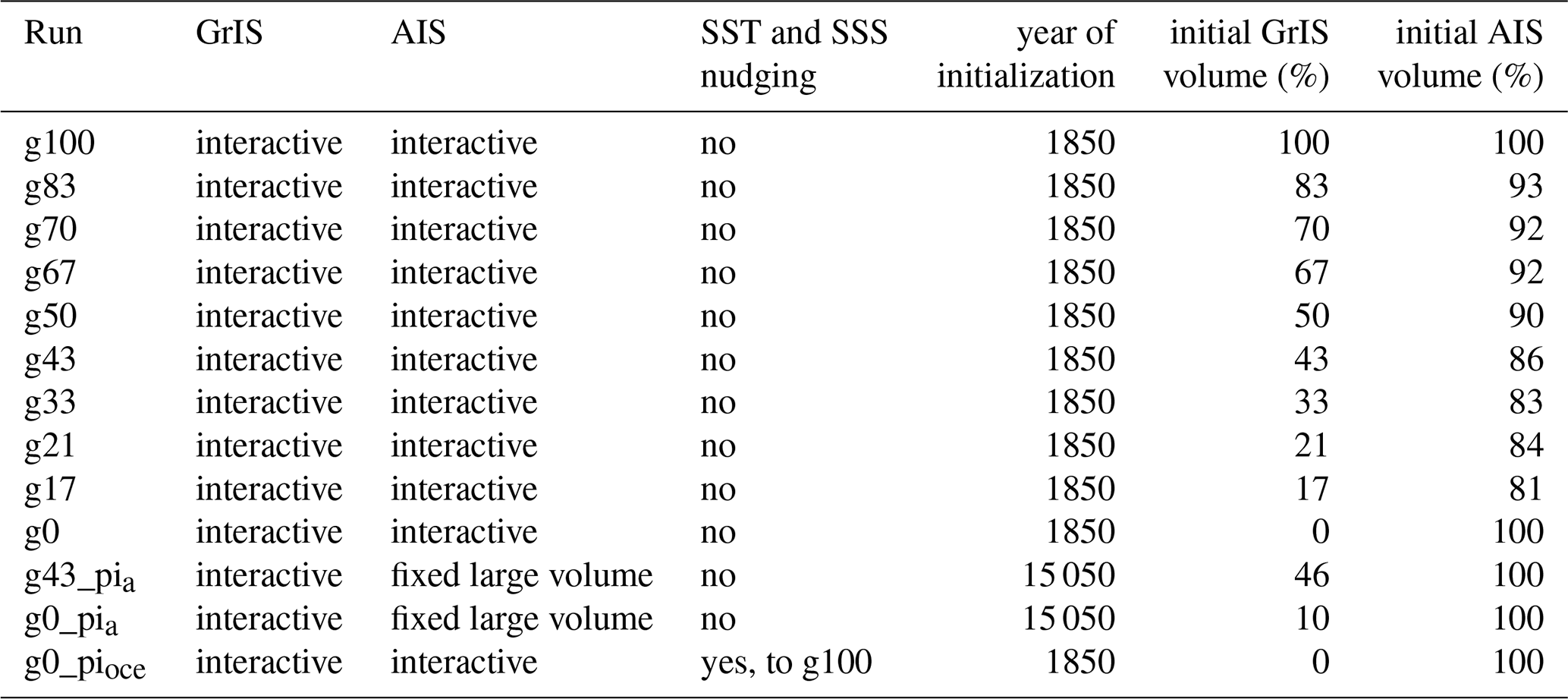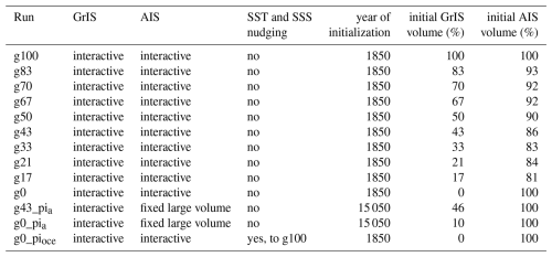 Table 1Overview of the simulations, including their names, which are indicative of the initial GrIS volume, whether an interactive GrIS and/or AIS was used, whether nudging of SST and SSS was applied, the year of initialization and the initial volume of the GrIS and AIS. The sensitivity experiments will be further explained throughout the analysis in Sect. 3.