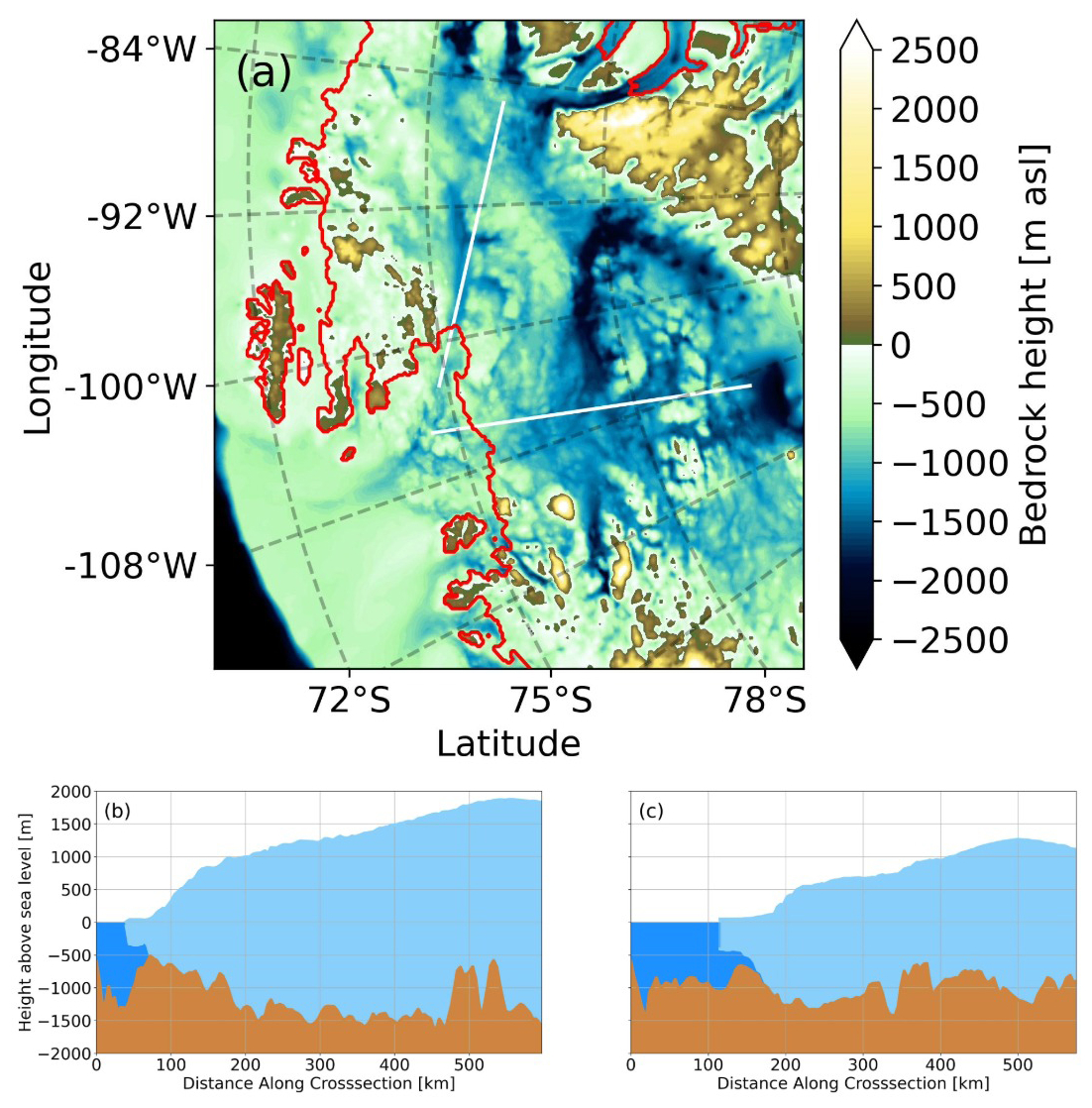 Figure 4Regional setting of TG and PIG. (a) bedrock profile of the Amundsen Sea Embayment with the observed grounding line position, using ice thickness and bedrock height observations from Morlighem et al. (2020) in red. White lines indicate the locations of the cross sections shown below. (Bottom row) cross sections with the ice sheet shown in light blue, the ocean in dark blue, and bedrock in brown. TG in (b) and PIG in (c).