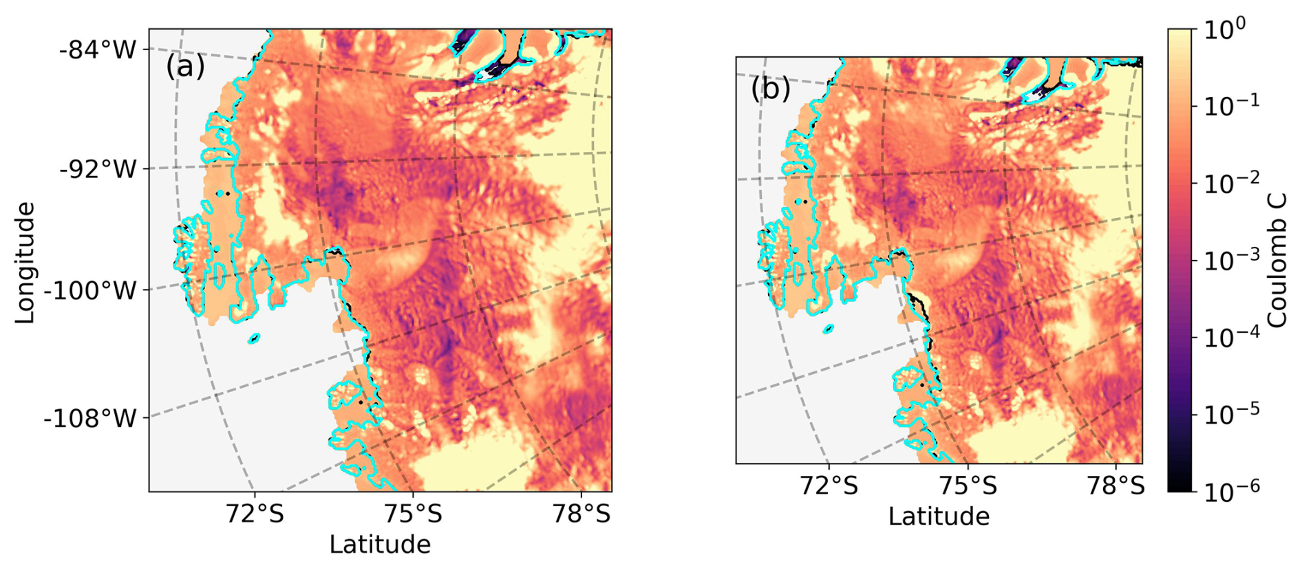 In this initialization, we apply the same approach as for the P05, but set p=1 (representing “good hydrological connectivity” as described by Leguy et al. (2014) instead of the p=0.5 used in Eq. (5) for the P05. This choice lowers the effective pressure in areas where the bedrock lies below sea level, which includes all grounding lines and many inland regions of the WAIS. Because effective pressure N appears in the Zoet–Iverson friction law as the product CcN, a reduction in N can be offset by increasing Cc, keeping basal friction unchanged at the end of initialization. However, since Cc is capped at 1, it cannot compensate for reduced effective pressure everywhere (as further discussed in Sect. 4.1). Moreover, while Cc remains fixed during continuation experiments, N varies with the modeled ice thickness. As a result, friction develops differently over time, which may change the evolution of ice thickness.