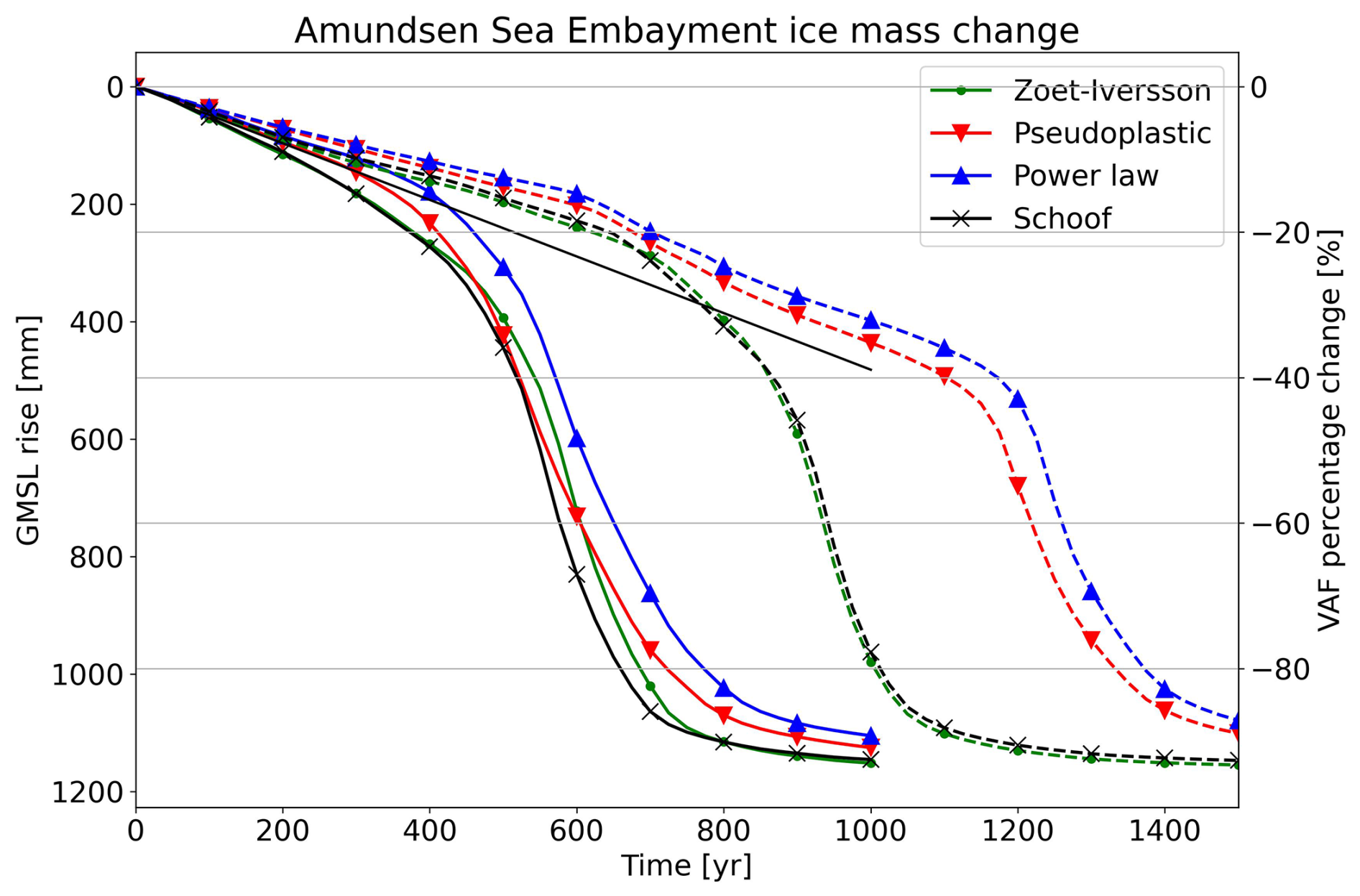 Most of the literature argues that power law friction will result in less modelled ice loss and sea level rise compared to Coulomb friction, both for idealized experiments (e.g., MISMIP-style experiments, see Asay-Davis et al., 2016) and for realistic simulations of the Antarctic Ice Sheet (AIS). However, authors do not agree whether the difference is substantial (Brondex et al., 2017; Sun et al., 2020; Brondex et al., 2019) or not (e.g., Barnes and Gudmundsson, 2022; Wernecke et al., 2022). Furthermore, basal friction parameterization tests in realistic settings such as the ASE or the entire AIS are often done with enormous (ABUMIP; Sun et al., 2020) or unrealistic perturbations (Barnes and Gudmundsson, 2022; Brondex et al., 2019). Fewer studies have addressed the importance of the friction law for WAIS collapse driven by less extreme, more realistic forcing.