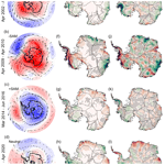 For the 2014–2016 El Niño-dominated period, we observed weak and, in some regions, non-significant positive SMB and ice mass anomalies in the Amundsen Sea sector and western Ross Sea (Fig. 4g, k). During this period, our cumulative ENSO and SAM were out of phase (El Niño/+SAM), as evidenced by significant negative pressure anomalies over the continent (Fig. 4c). The positive pressure anomaly in the Pacific was located away from the coastline and was associated more with wind anomalies along the shore, rather than onshore (Fig. 4c).