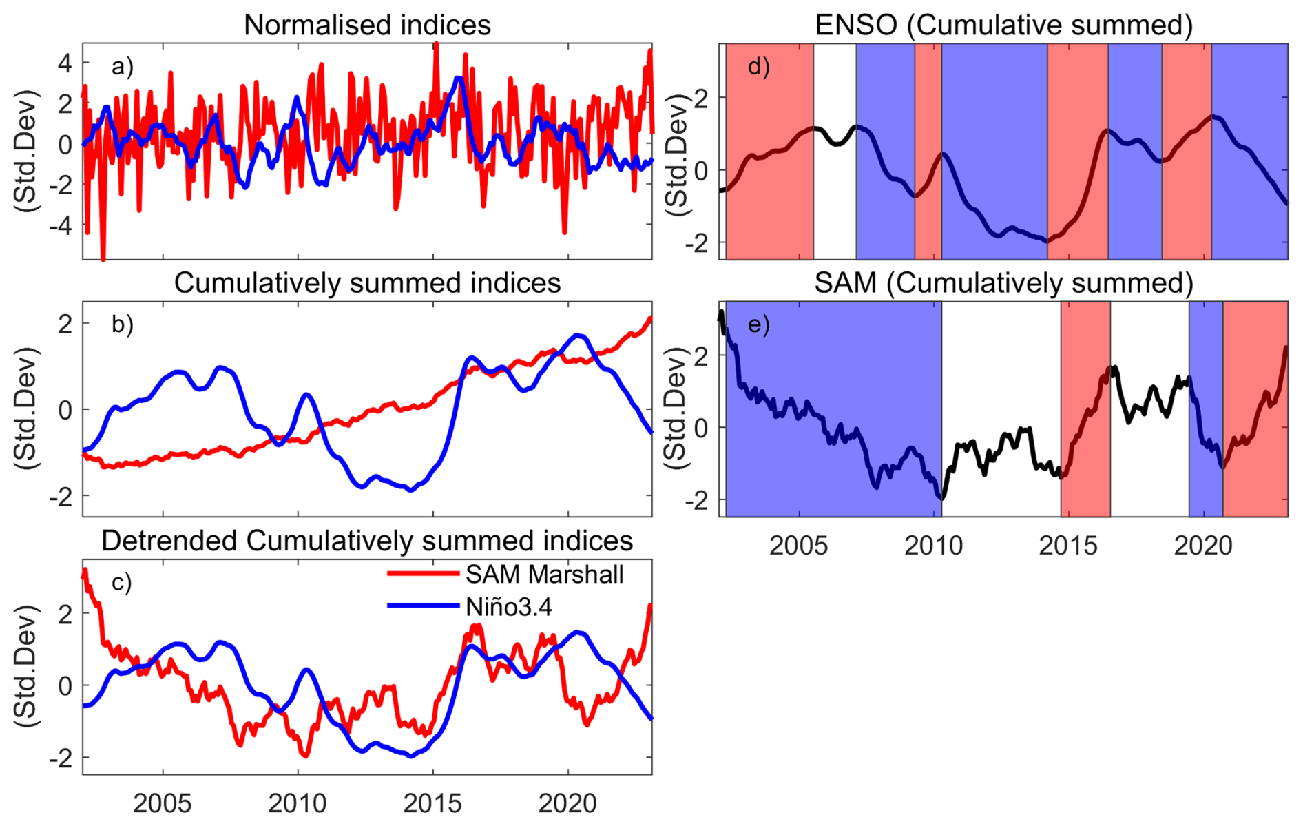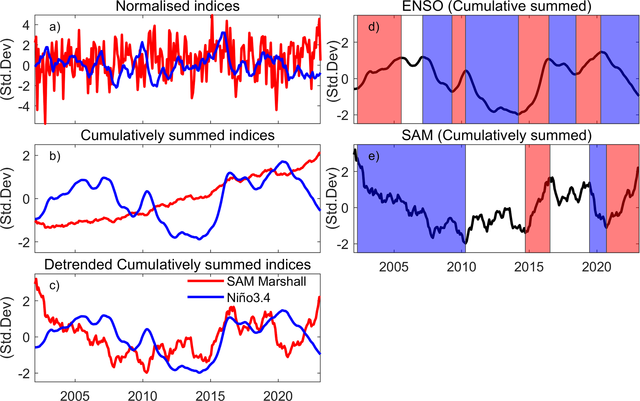 Figure 1Monthly climate indices of SAM (Marshall, 2003) and Niño3.4 from 2002–2022: (a) normalised SAM and Niño3.4 indices; (b) normalised cumulatively summed SAM and Niño3.4 indices; (c) detrended, cumulatively summed SAM and Niño3.4 indices (normalised). Periods until positive and negative peaks are reached in the cumulatively summed Niño3.4 are defined as El Niño-dominated and La Niña-dominated periods, respectively, represented as red and blue shaded areas in (d). Similarly, periods until positive and negative peaks are reached in the cumulatively summed SAM index (Marshall, 2003) are defined as SAM-positive and SAM-negative dominated periods, respectively, denoted as red and blue shaded areas in (e). Neutral dominated periods are represented by white shading.